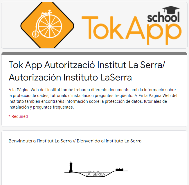 - Omple aquest FORMULARI DE REGISTRE. MOLT IMPORTANT: heu de posar el telèfon on s’instal·larà l’aplicació de TokApp School.
