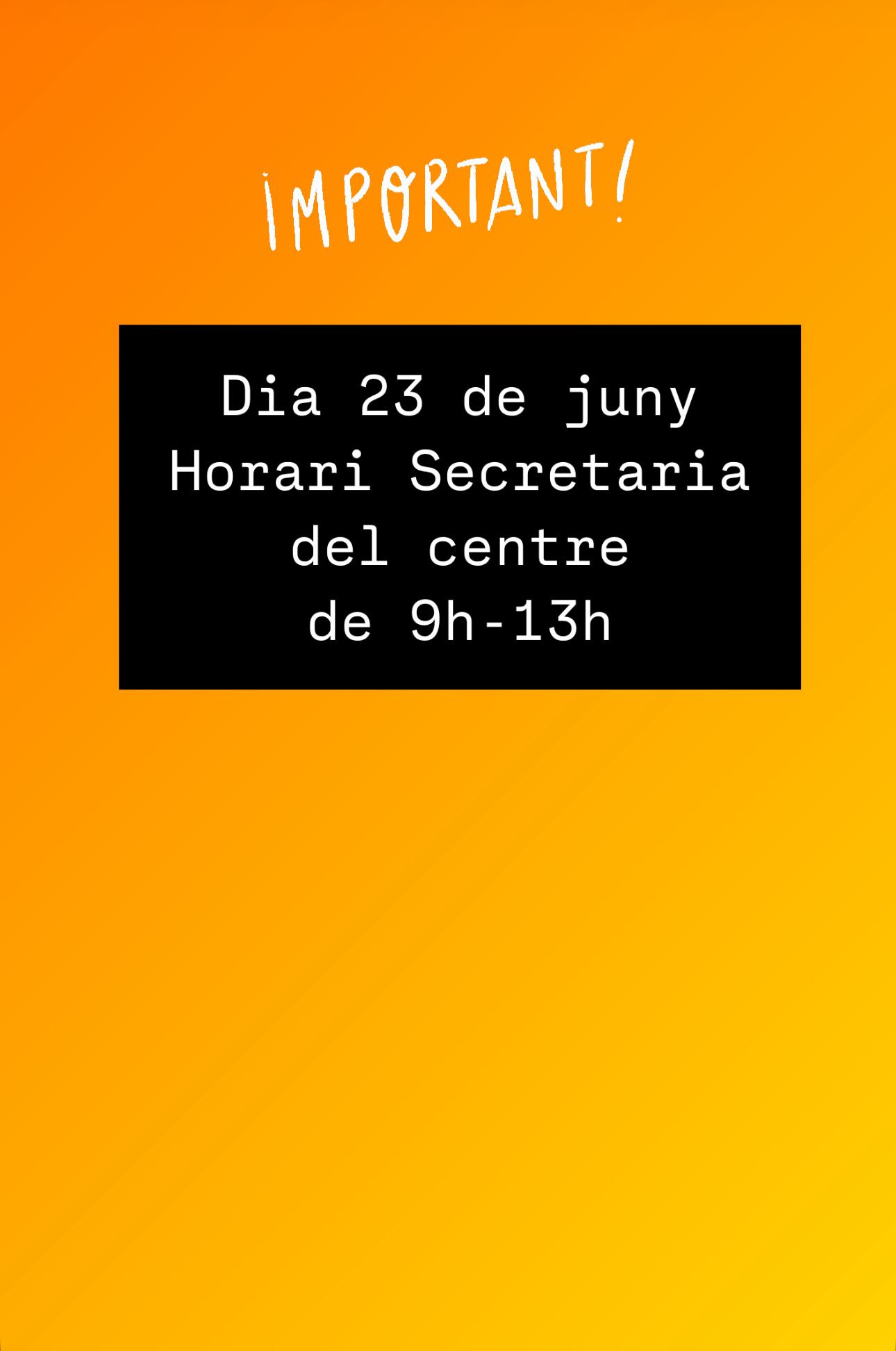 23 juny: Horari especialPer admin / 10/06/2025 / 24-25 Portada Benvolgudes famílies, us informem que el proper 23 de juny l’horari de secretaria i administració és de 9 a 13h. La resta de dies serà horari normal de 8:00 a 14:30h Moltes gràciesç