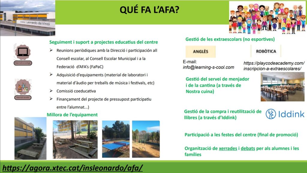 L’AFA és l’associació que representa a les famílies dels alumnes de l’institut. Aquesta tasca de representació l’exercim: