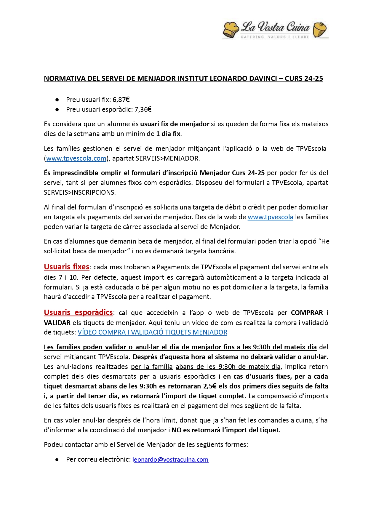 Si voleu comunicar-vos amb la comissió de menjador podeu fer-ho a l’adreça electrònica: menjador.ins.leonardo.afa@gmail.com