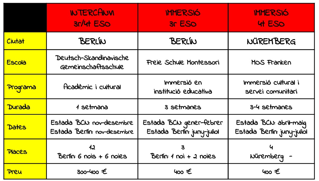 Abans del Nadal, 12 alumnes de 3r i 4t d’ESO van participar en una setmana d’intercanvi amb l’escola Deutsch-Skandinavische Gemeinschaftsschule de Berlín. La primera fase de l’intercanvi va tenir lloc al novembre quan nosaltres vam fer d’amfitrions dels companys alemanys i, la segona, es va desenvolupar al desembre quan vam visitar Berlín per continuar amb el programa cultural i acadèmic iniciat a Barcelona.