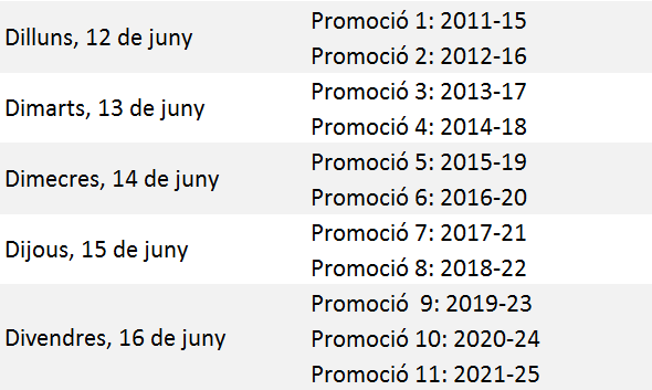 Estigueu atents a les nostres xarxes. A partir de dilluns 12 de juny fins el dissabte 17 publicarem cada dia vídeos amb què recordarem cadascuna de les promocions de l’Hipàtia: