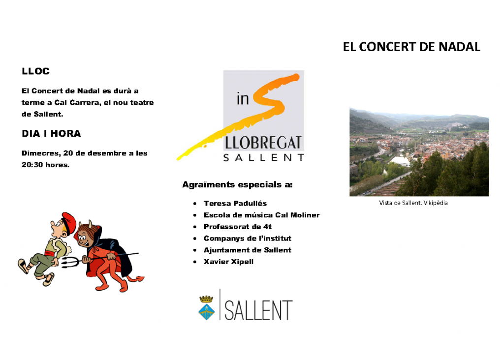 Aquest dimecres 20 de desembre a les 20.30 h els alumnes de 4 d’ESO de l’institut organitzen un Concert de Nadal a Cal Carrera. En aquest concert i participen tots els alumnes d’ESO del centre. Les entrades es poden comprar a la taquilla del teatre el mateix dia.