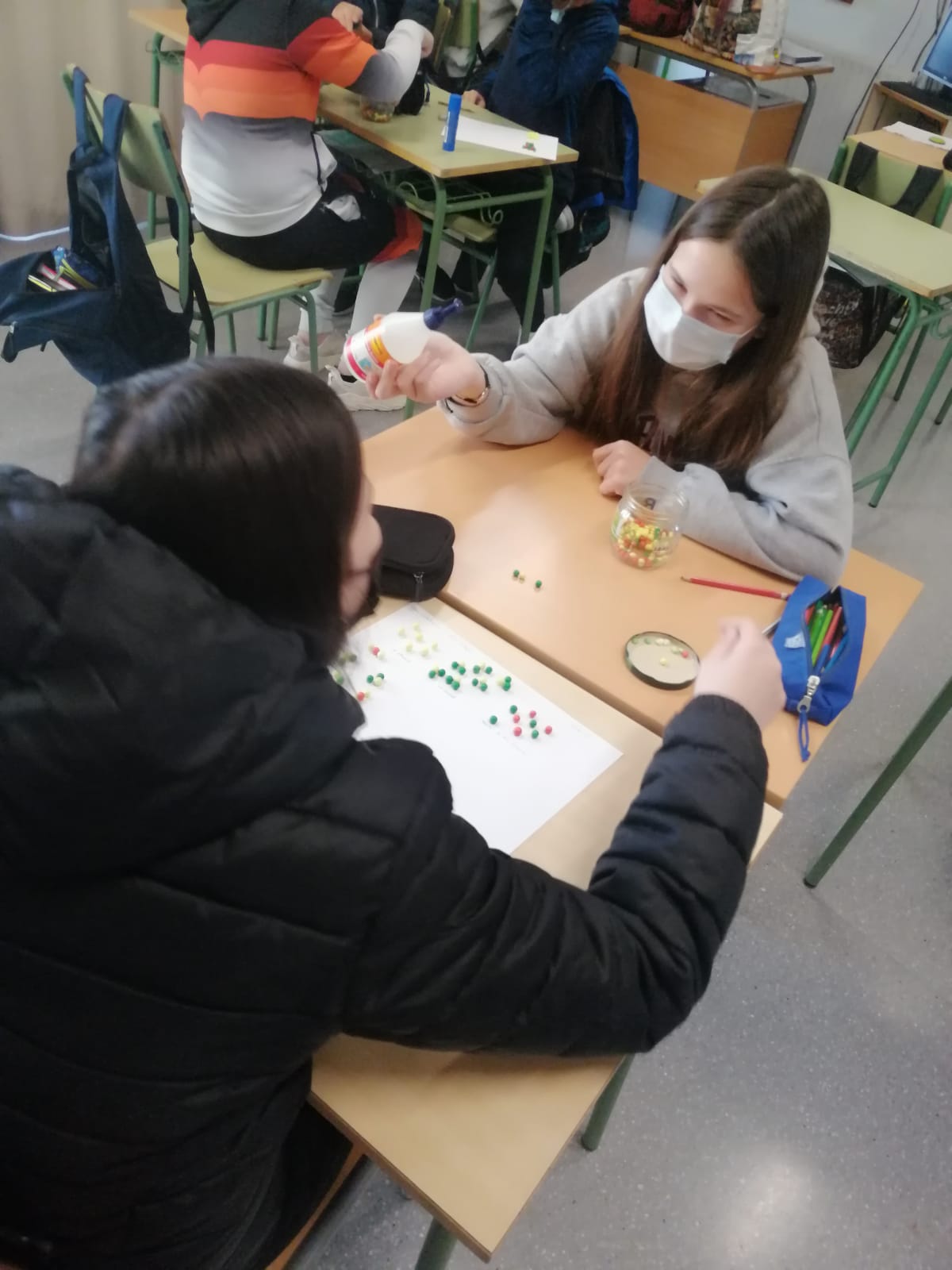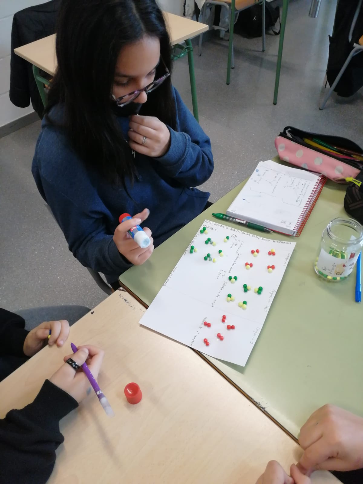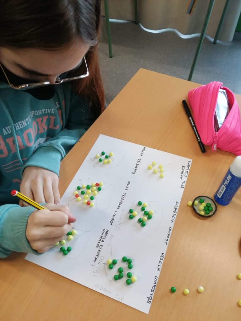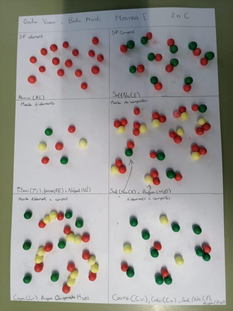 Durant aquest segon trimestre els/les alumnes de 2n d’ESO de Ciències Naturals han representat substàncies formades per àtoms o per compostos, treballant el concepte de substàncies pures i mescles. Els alumnes han fet servir esferes de porex de diferents colors per identificar compostos que ens envolten, com l’aigua, el diòxid de carboni, el butà o l’ozó.