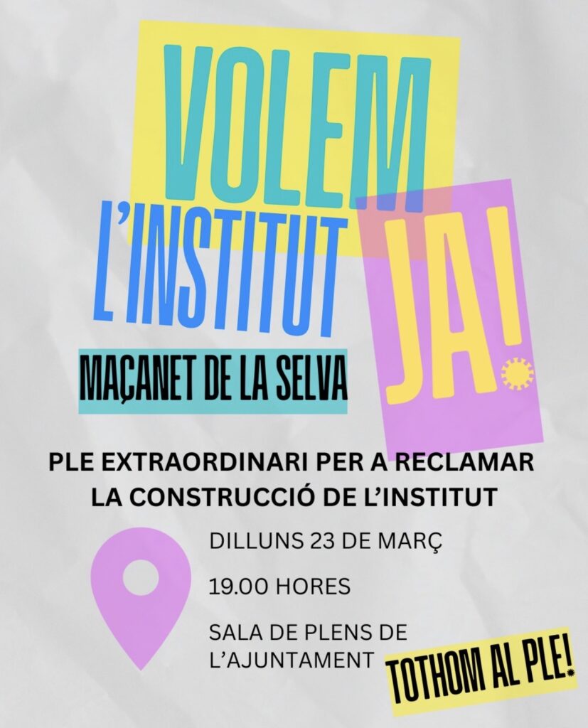 Tota la informació a https://www.xn--maanetdelaselva-fmb.cat/ca/el-ple-de-lajuntament-de-macanet-de-la-selva-aprovara-una-mocio-per-reclamar-la-construccio-immediata-de-linstitut