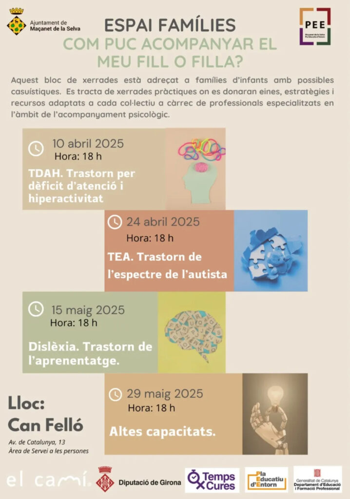 Cicle de xerrades gratuĂŻtes pensades per a famĂlies amb infants amb diferents casuĂstiques. Professionals especialitzats oferiran eines i estratègies Ăştils!