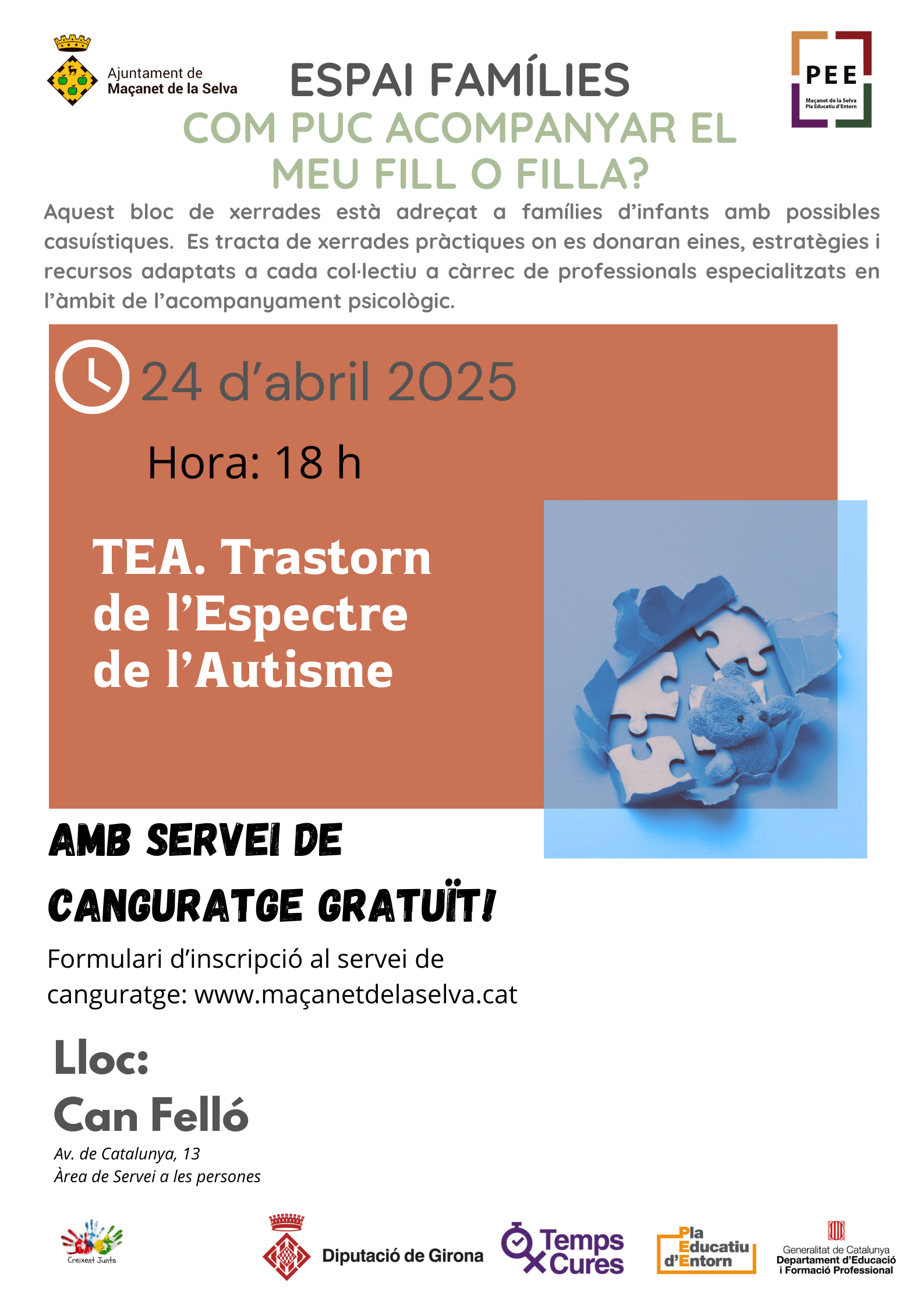 đź§©24/04 – TEA: Trastorn de l’espectre de l’autista. La sessiĂł anirĂ a cĂ rrec de NĂşria Roca i Alba Badia, professionals del centre multidisciplinari El CamĂ de Tordera.