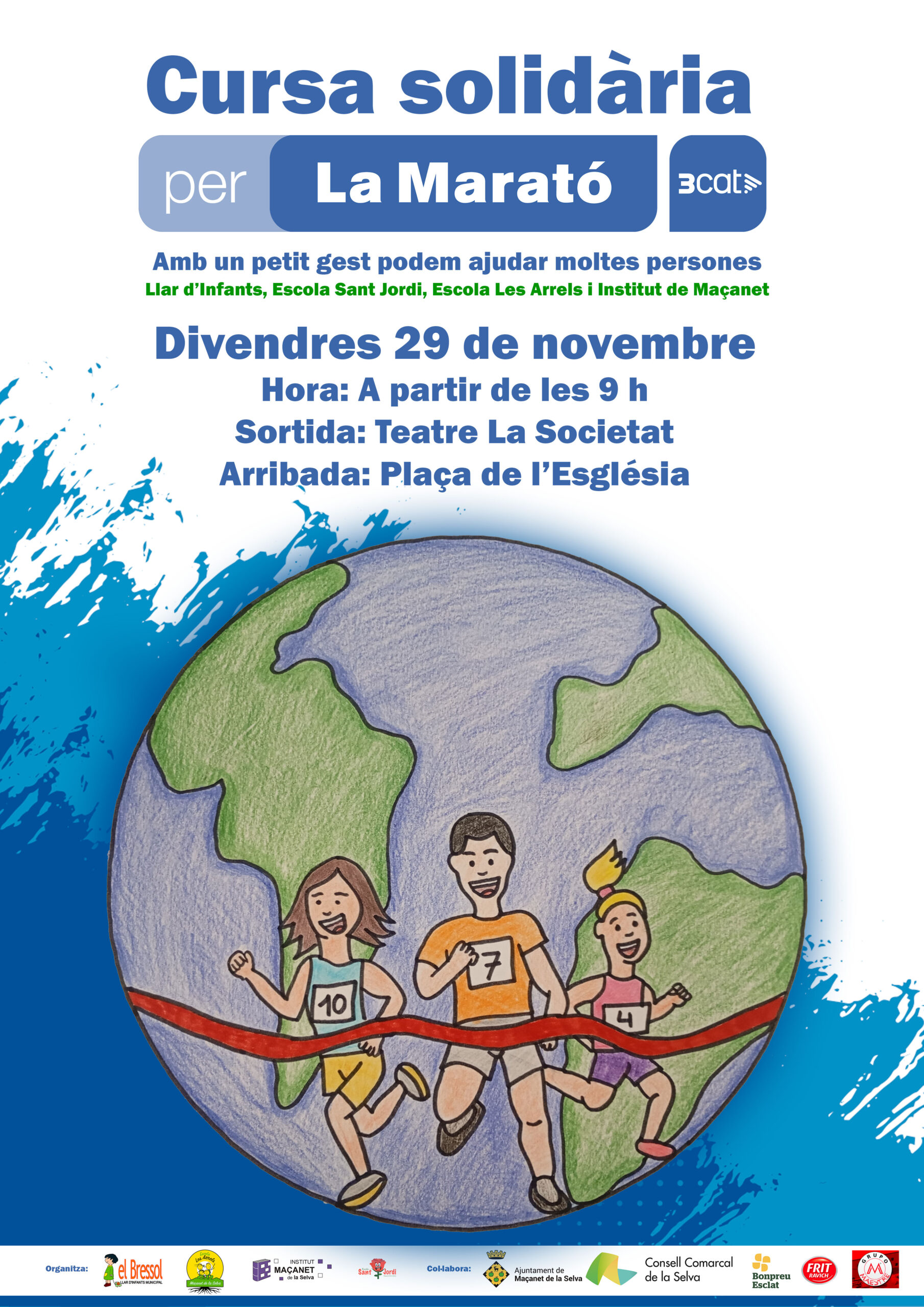 El proper divendres 29 de novembre els centres educatius de Maçanet de la Selva, amb la col·laboració de l’Ajuntament, farem una cursa solidària pel poble a favor de la Marató d’enguany que tracta sobre les malalties respiratòries.