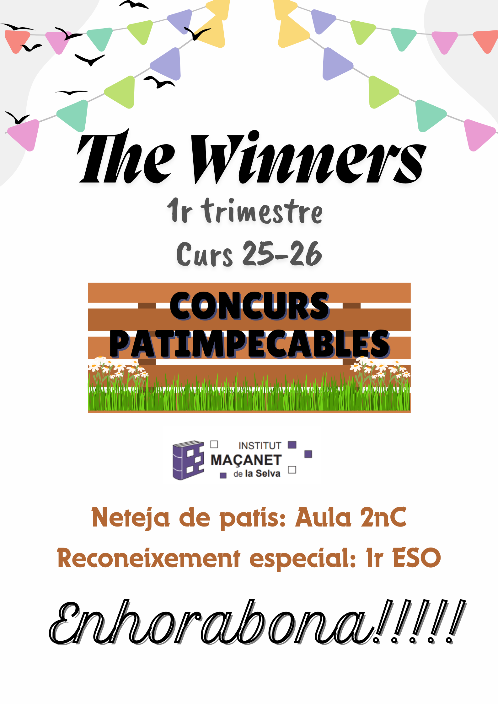 També fem un reconeixement especial per mantenir el pati net a 1r. Es va deixar de sortir a netejar perquè no l’embrutien, amb el compromís de mantenir-ho així. Com que s’ha mantingut durant aquest trimestre, seran premiats amb el gaudi de més temps de pati per un dia, a la zona de les pistes (Les Arrels).
