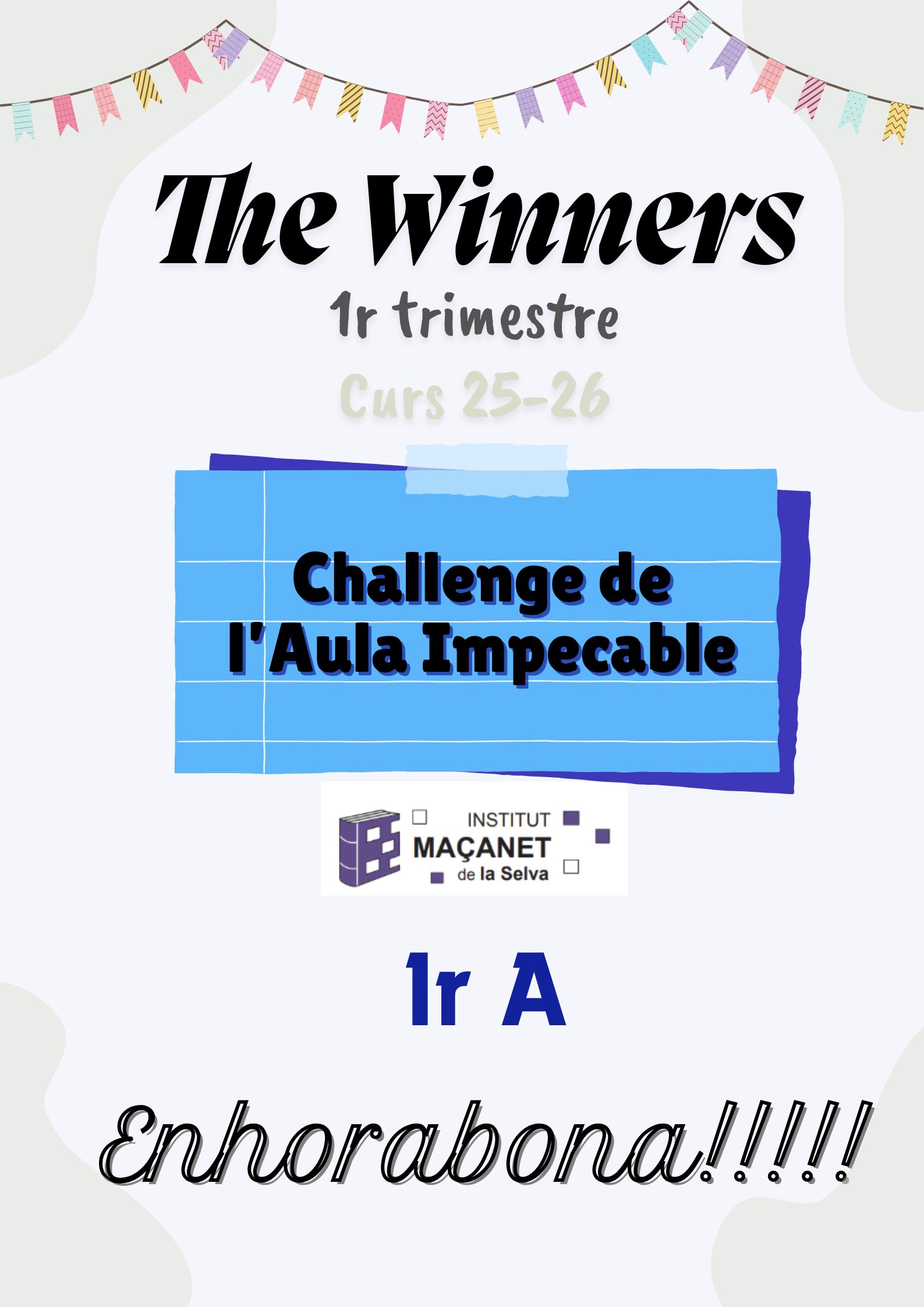 L’aula de 1rA és la guanyadora del Challenge de l’Aula Impecable, en aquest 1r trimestre de curs! El premi atorgat a l’aula guanyadora és a escollir entre una hora de tutoria per fer una activitat a petició del grup o gaudir d’una hora de tutoria al parc proper al recinte escolar.