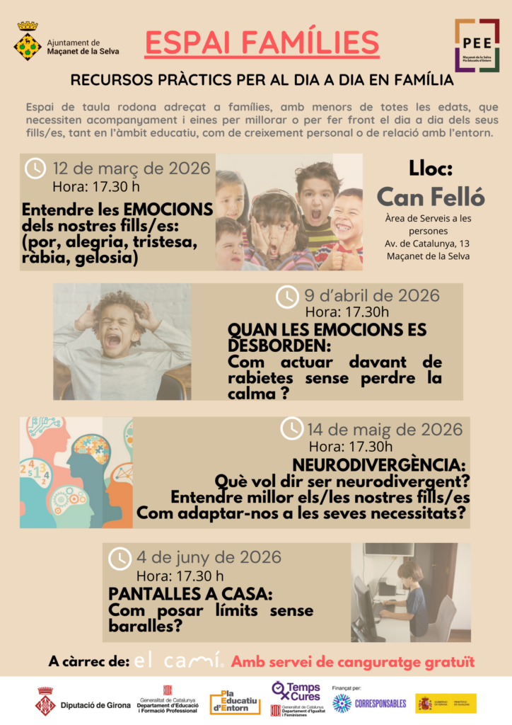 La primera sessió tindrà lloc el dijous 12 de març a les 17.30 h i estarà dedicada a les emocions, amb l’objectiu de conèixer-les millor i entendre què els passa als infants i joves.