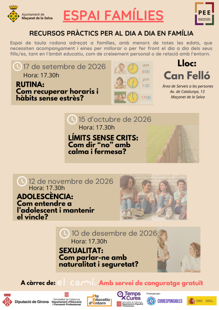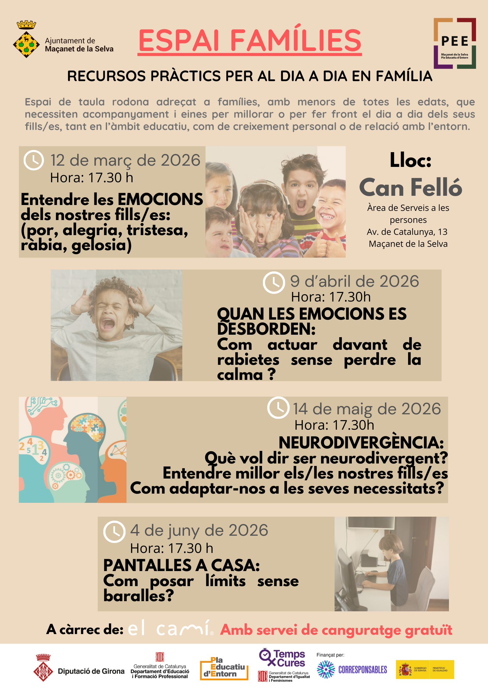 L’Espai Famílies és un recurs gratuït de suport a les famílies que neix de la voluntat de l’Ajuntament i de la comunitat educativa d’acompanyar-les en el procés de creixement personal i educatiu dels seus fills i filles. Aquest servei s’inclou dins l’apartat Servei a les Persones – Educació del web municipal.