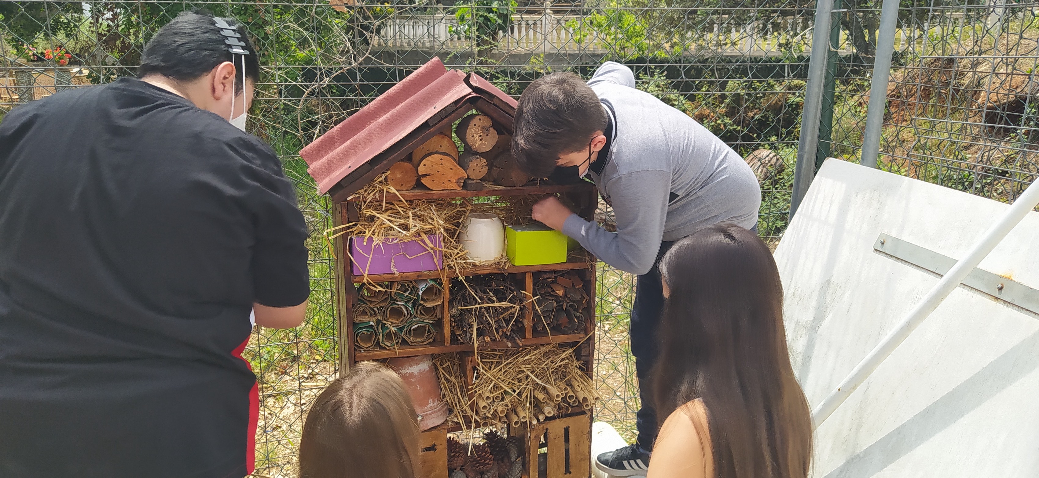 Els dos alumnes de l’aula Rubik de 1r d’ESO han estat treballant aquest curs un projecte de biodiversitat que ha finalitzat amb la construcció d’un hotel d’insectes. Alguns dels seus companys del grup-classe els han estat ajudant i, finalment, tot el grup de 1r C ha fet una visita a l’hotel. Durant la visita, han fet preguntes i han pres dades per fer un informe.