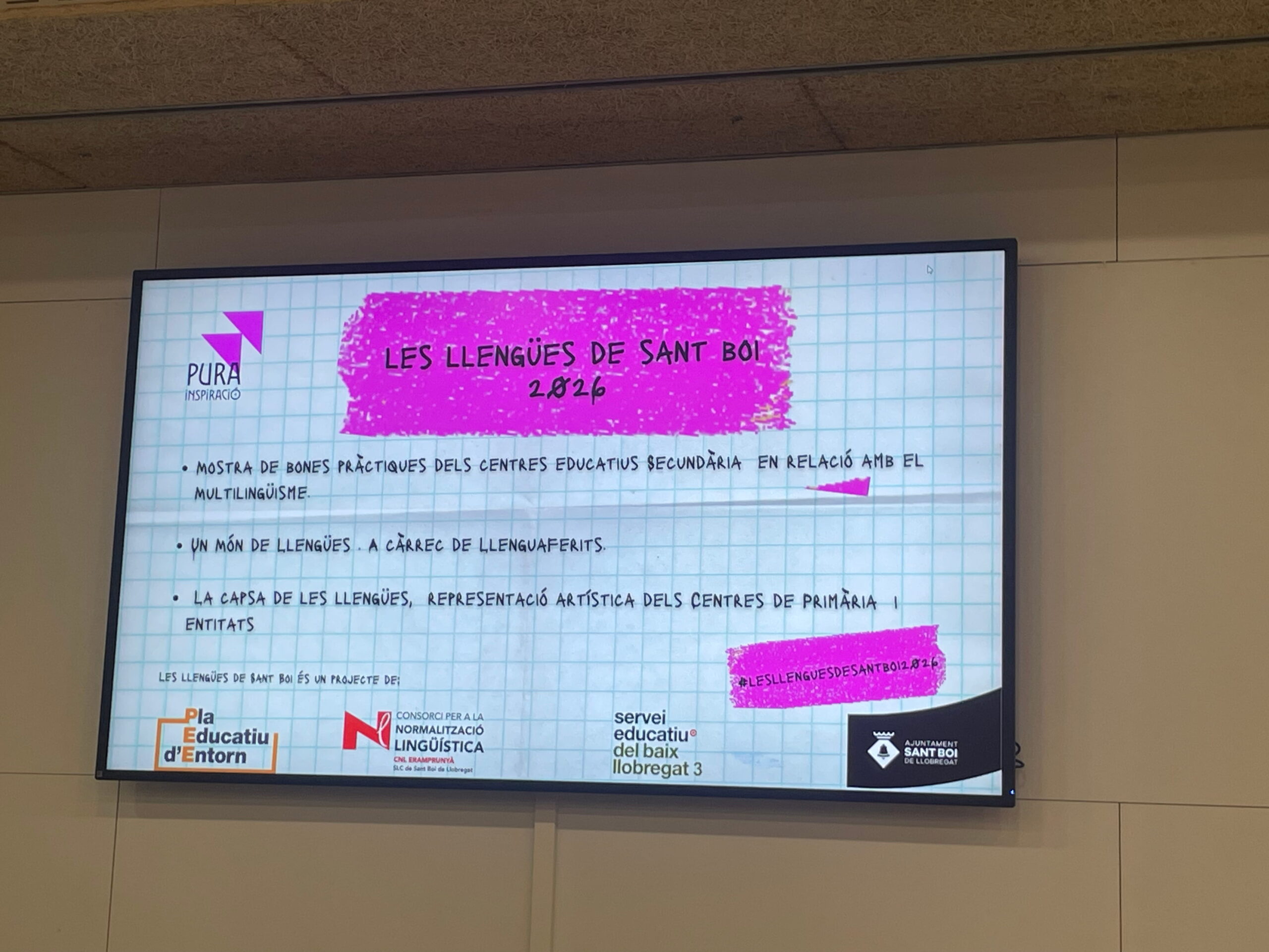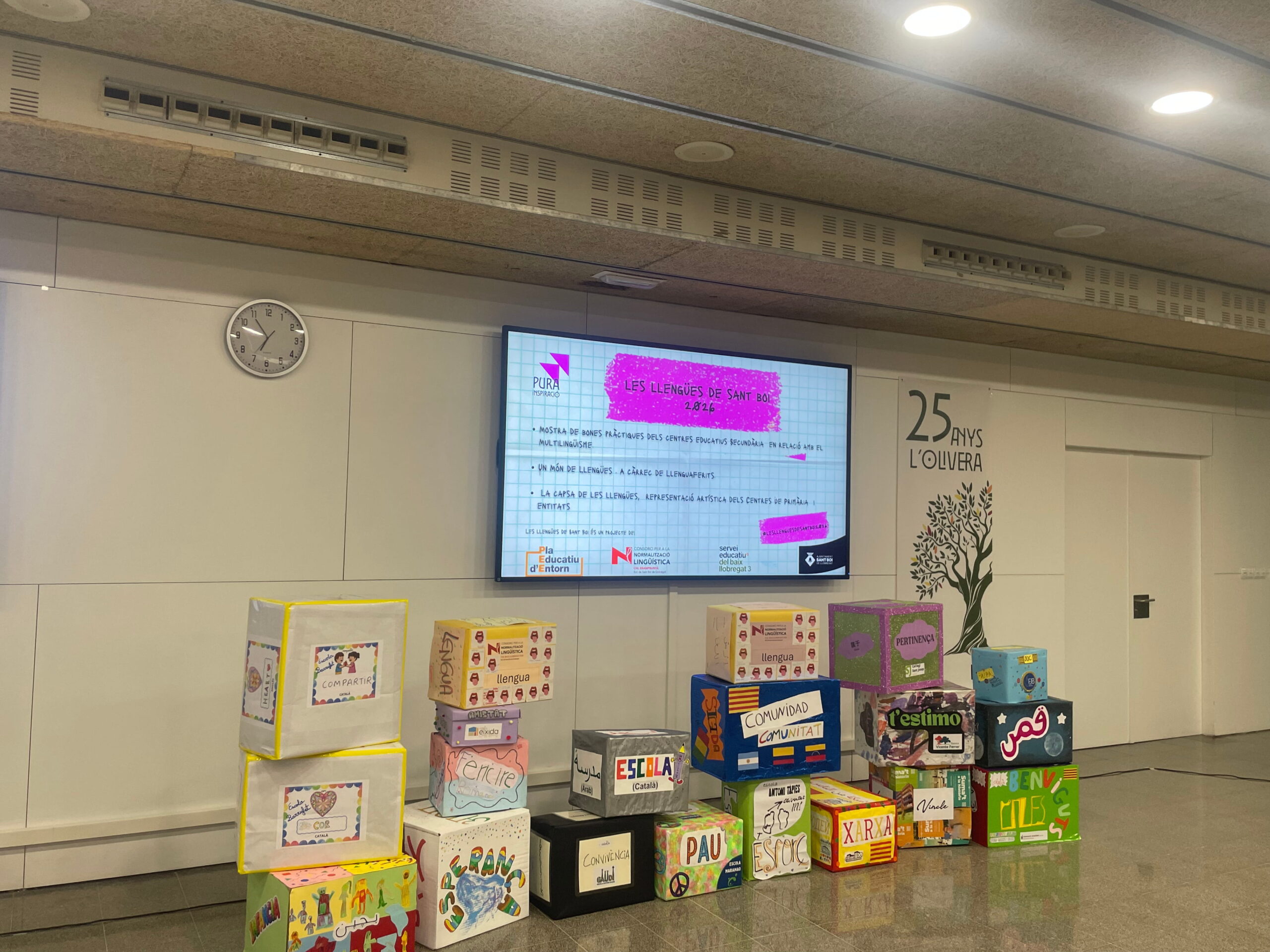 L’alumnat de secundària va presentar diferents vídeos sobre els projectes treballats vers les llengües d’origen i l’alumnat de primària, va exposar les capses de les llengües. A més, van poder gaudir d’un taller de Llenguaferits “Assertius amb el català”.