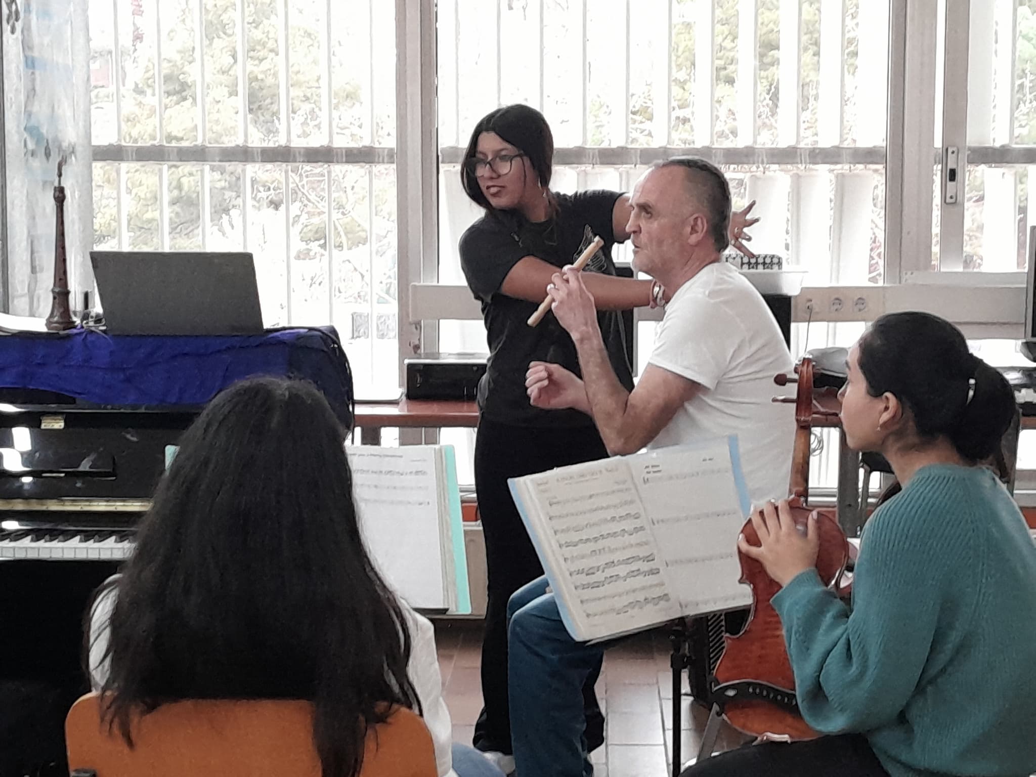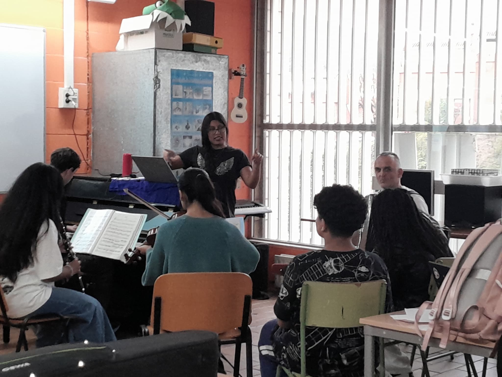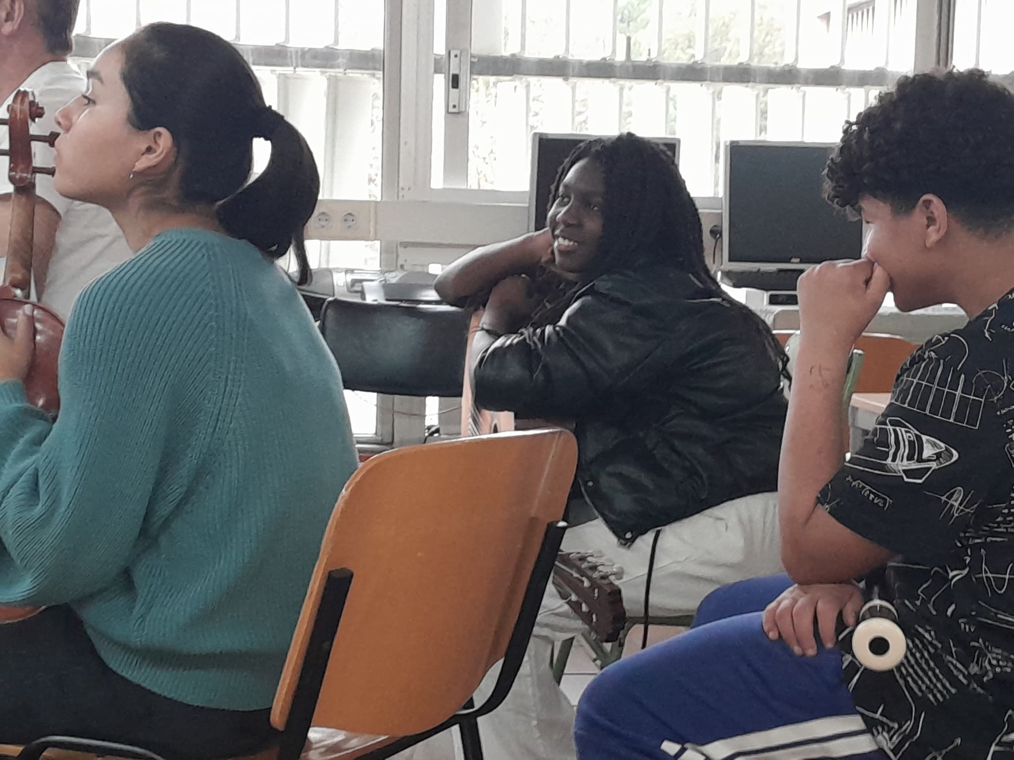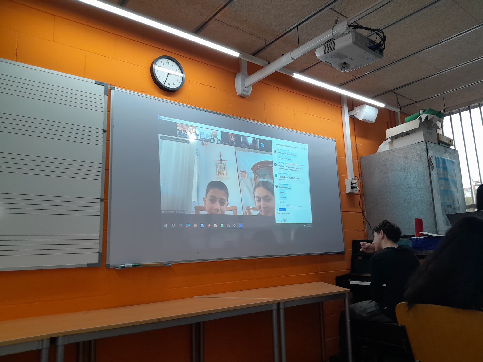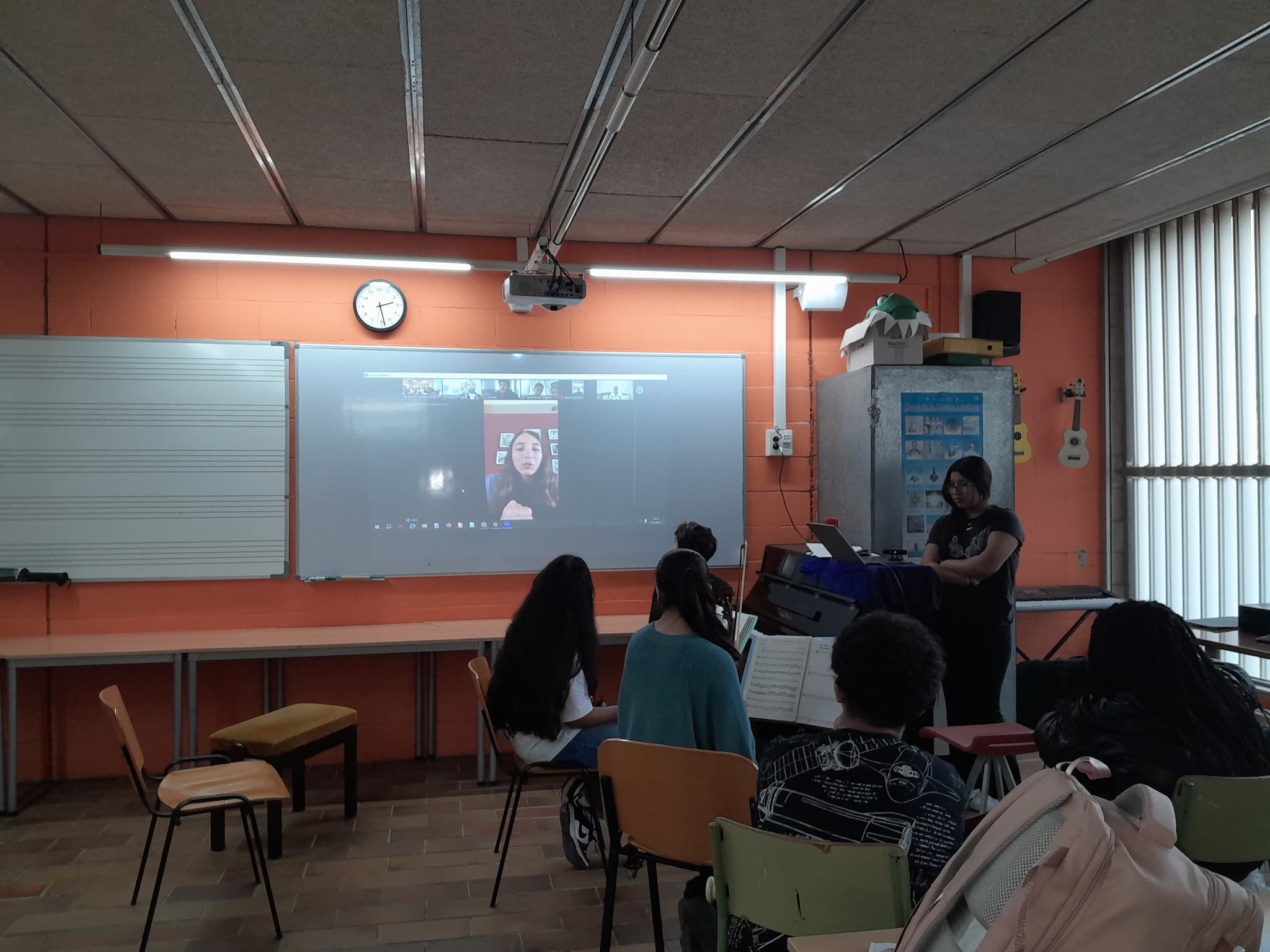 Si durant la darrera trobada aquests i aquestes estudiants estaven al Conservatori i nosaltres cadascú en casa nostra a causa de la suspensió de les classes i l’activitat sanitària no urgent a tot Catalunya per fort vent, avui ha passat tot el contrari. Nosaltres ens hem ajuntat a l’aula de música de l’institut i ells i elles s’han connectat cadascú des de sa casa, per culpa de l’actual situació bèl·lica que ha fet tancar tots els centres educatius i conservatoris de música a tot el Llevant. Tot i això, hem pogut passar una estona molt agradable amb aquella gent, fent-los oblidar per una estona els actuals esdeveniments i, a més, fent-los riure molt.