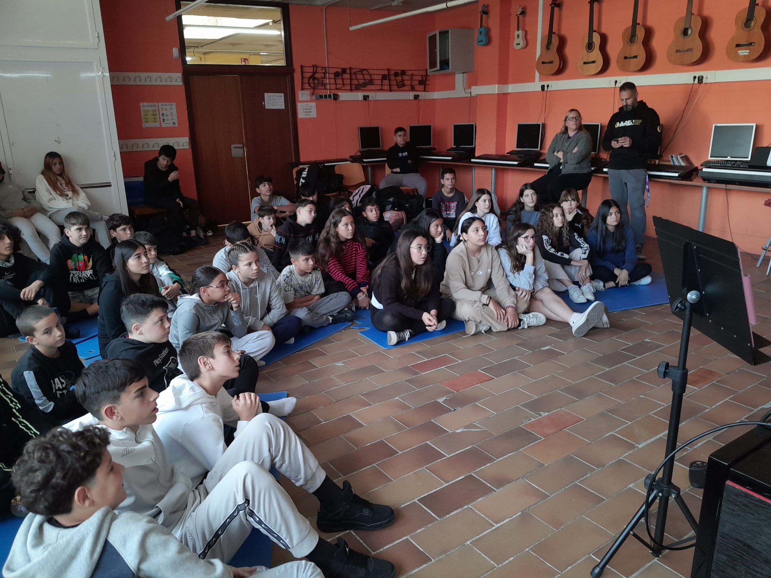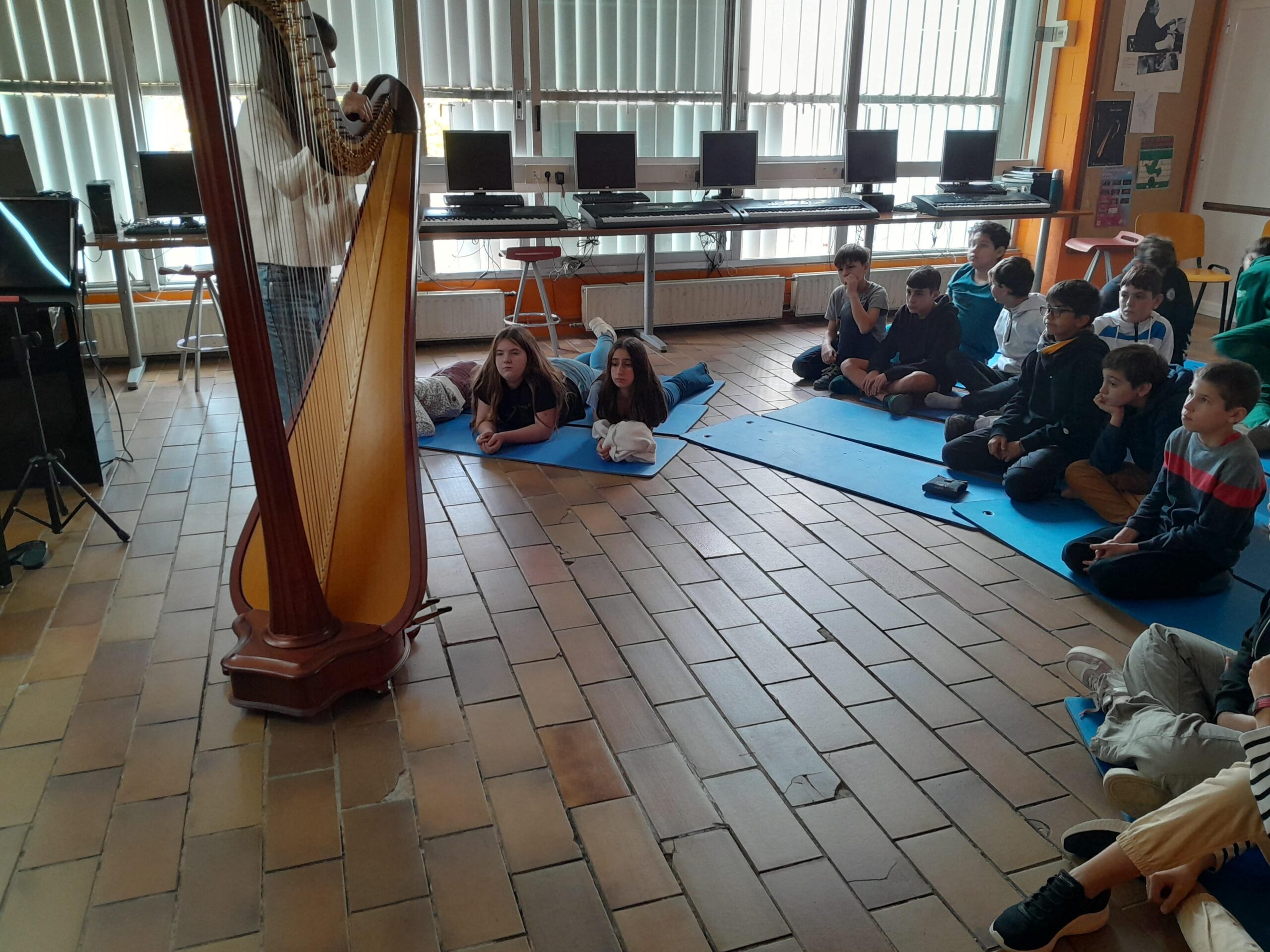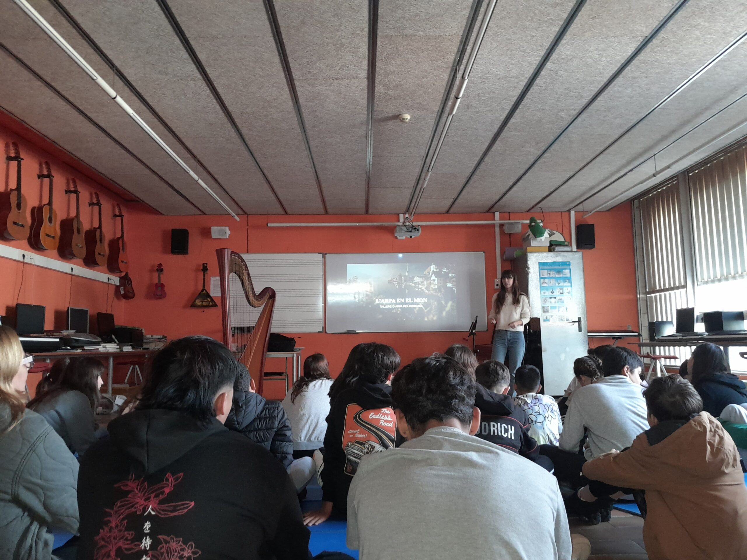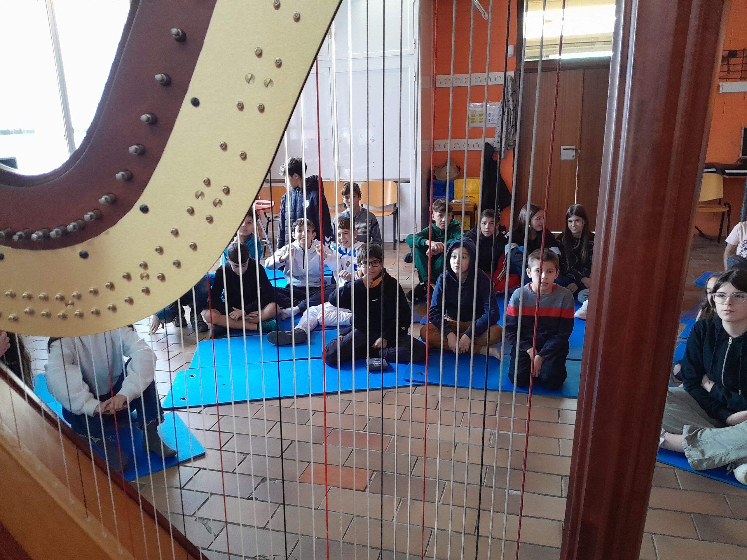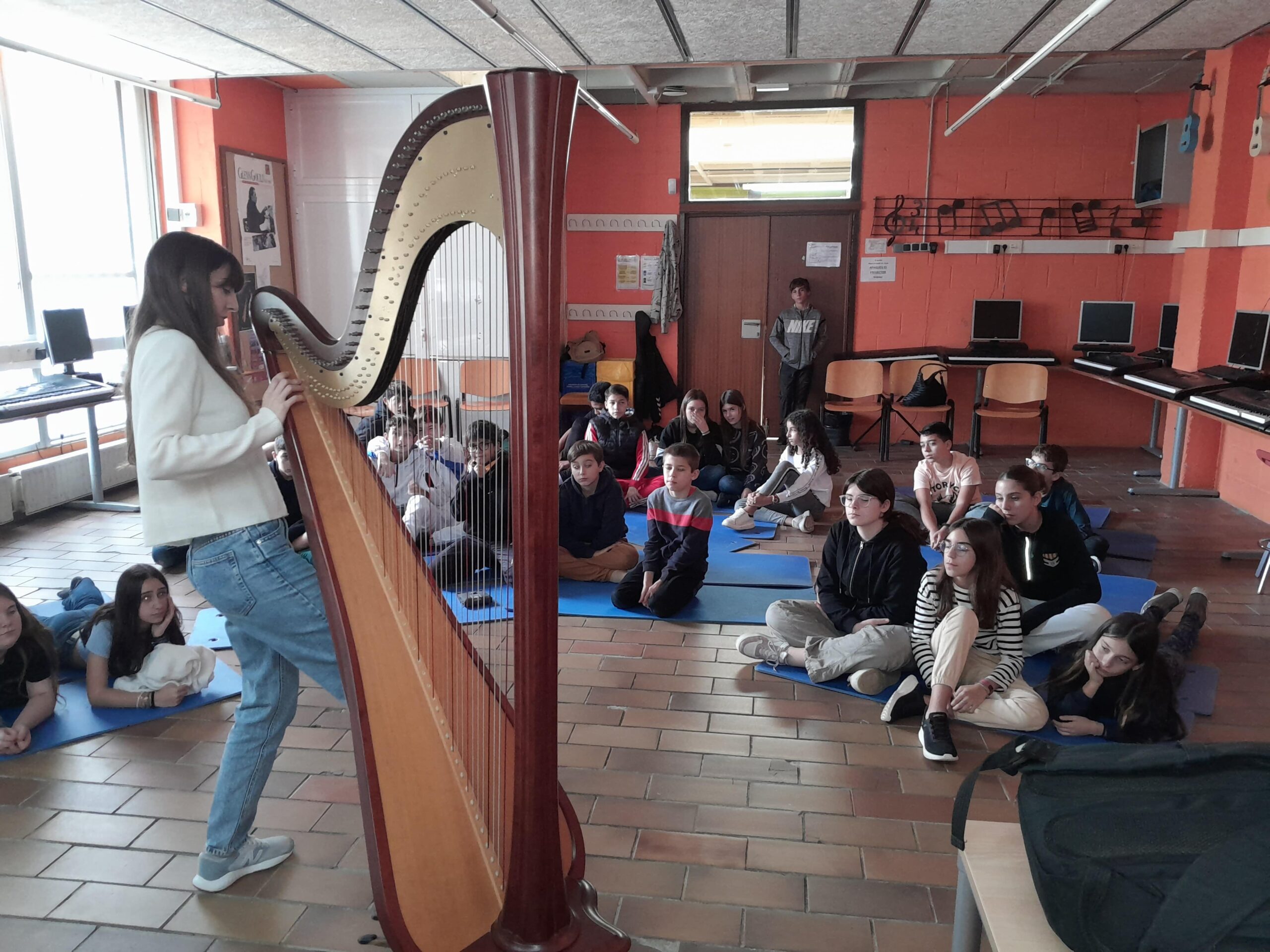 El divendres 8 de novembre de 2024 l’alumnat de 1r ESO va fer un taller d’arpa a l’aula de música del nostre institut, amb una noia que es deia Elsa que ens ho va ensenyar tot sobre l’arpa. És així com va explicar la història d’aquest instrument, com s’utilitzava a diferents cultures, quines característiques tècniques té i quines són les seves parts. També ens va dir que té 47 cordes de diferents colors fetes de diferents materials, però que en realitat són més, ja que té uns pedals que canvien el so de les cordes. Una curiositat és que es toca només amb quatre dits, sense utilitzar mai el dit xicotet. Després ens va tocar unes notes amb l’arpa i havíem d’endevinar que imitava un riu. En acabant, va tocar unes melodies molt boniques i, sortosament, tot l’alumnat vàrem poder tocar una mica l’arpa. Va ser mel de romer. L’alumnat va sortir amb moltes ganes de tocar l’arpa, tot i que siga complicat. La valoració de l’alumnat és que va ser un taller molt interessant, divertit i impressionant, que el so de l’arpa era molt relaxant i bonic i que més d’un s’ha sentit com en els núvols.