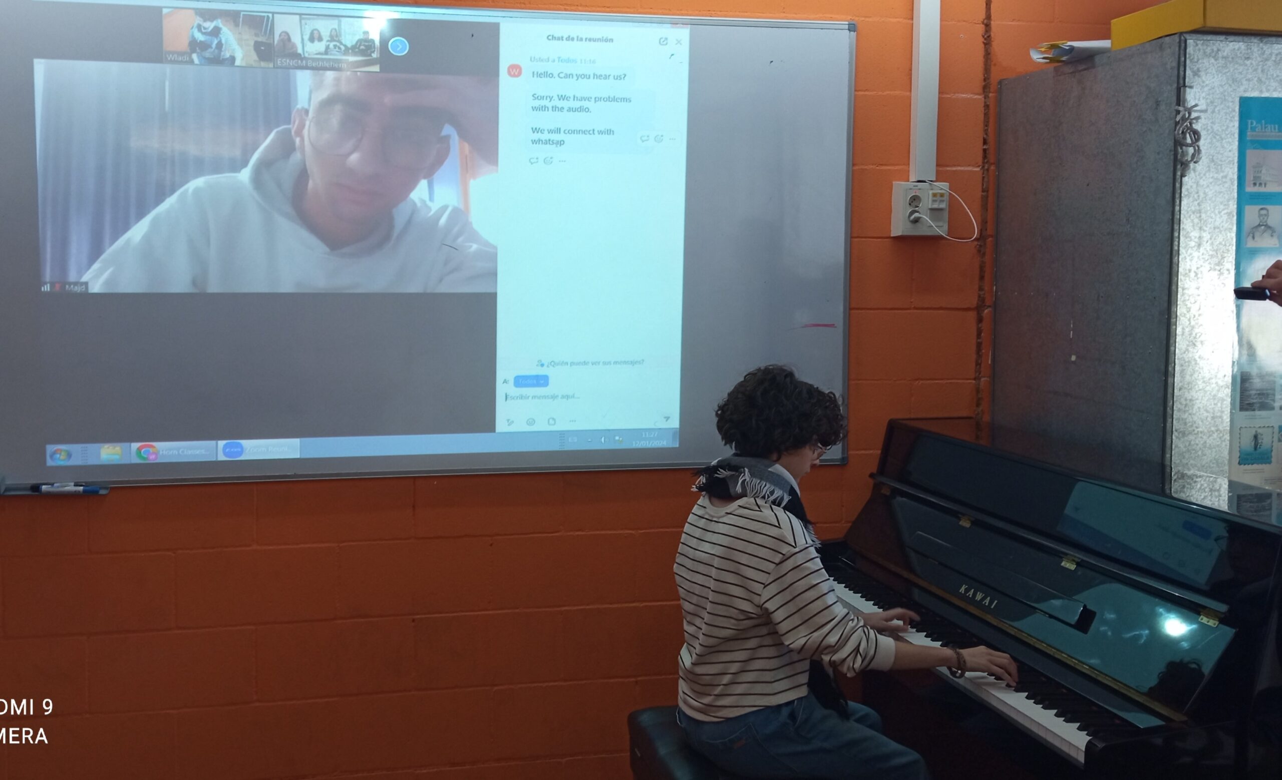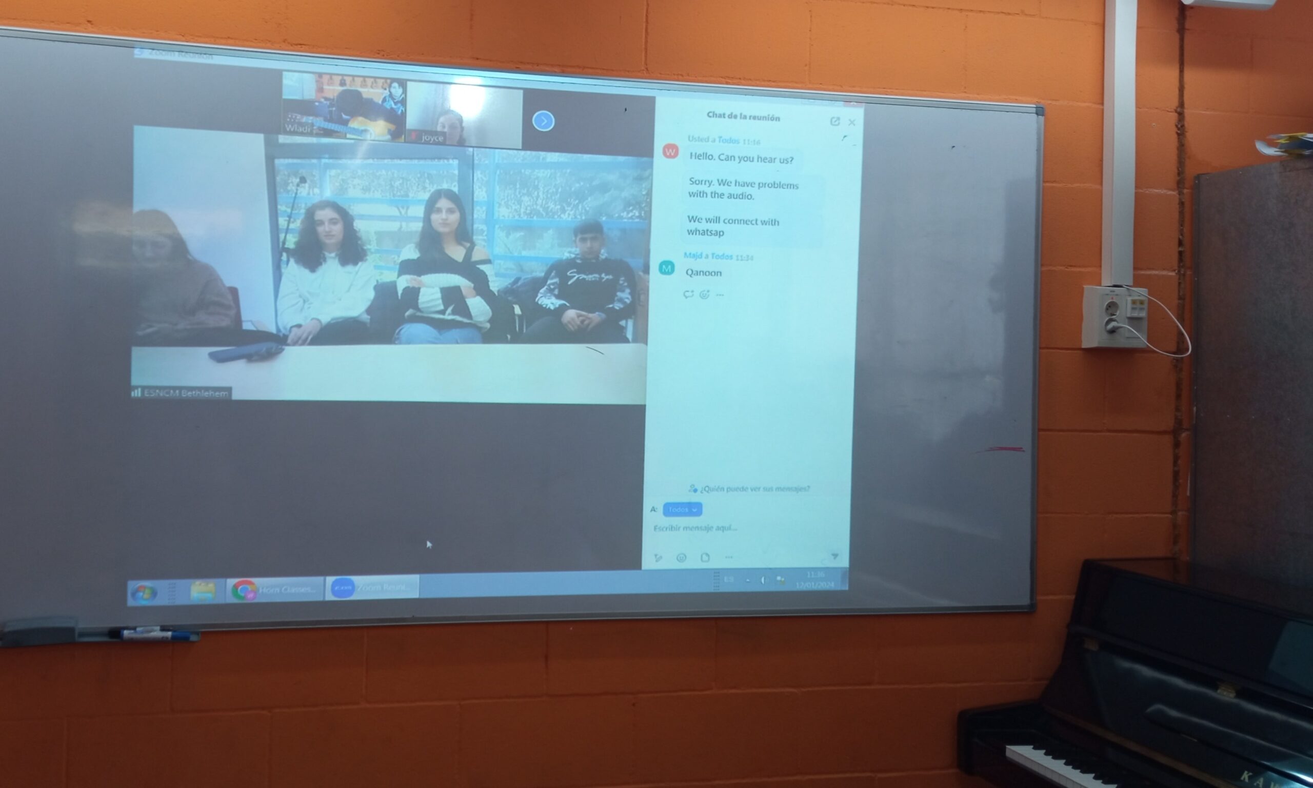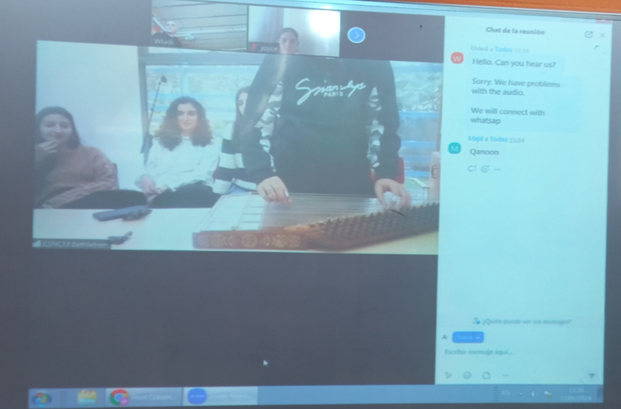 Aquest divendres 12 de gener un grup d’alumnes del nostre institut hem fet una primera trobada virtual amb alumnes músics d’aquest conservatori palestí. L’activitat ha consistit en presentar-nos individualment, comentar els nostres estudis i aficions i tocar una peça musical amb el nostre instrument. Hem tocat peces musicals amb el trombó, el baix elèctric i el piano. Ells han tocat cançons amb l’oud i el qanun. Cal destacar que l’oud és l’ancestre del llaüt i, per tant, de la nostra guitarra. Així mateix, el qanun és un instrument de corda pinçada horitzontal avantpassat del clavicèmbal. Tots els dos grups hem rigut una mica quan ens hem confós pensant que Mina, el noi que tocava el qanun, era el nom de l’instrument musical. Per cert, han tocat molt bé, doncs són alumnes molt avançats que voregen el virtuosisme musical.