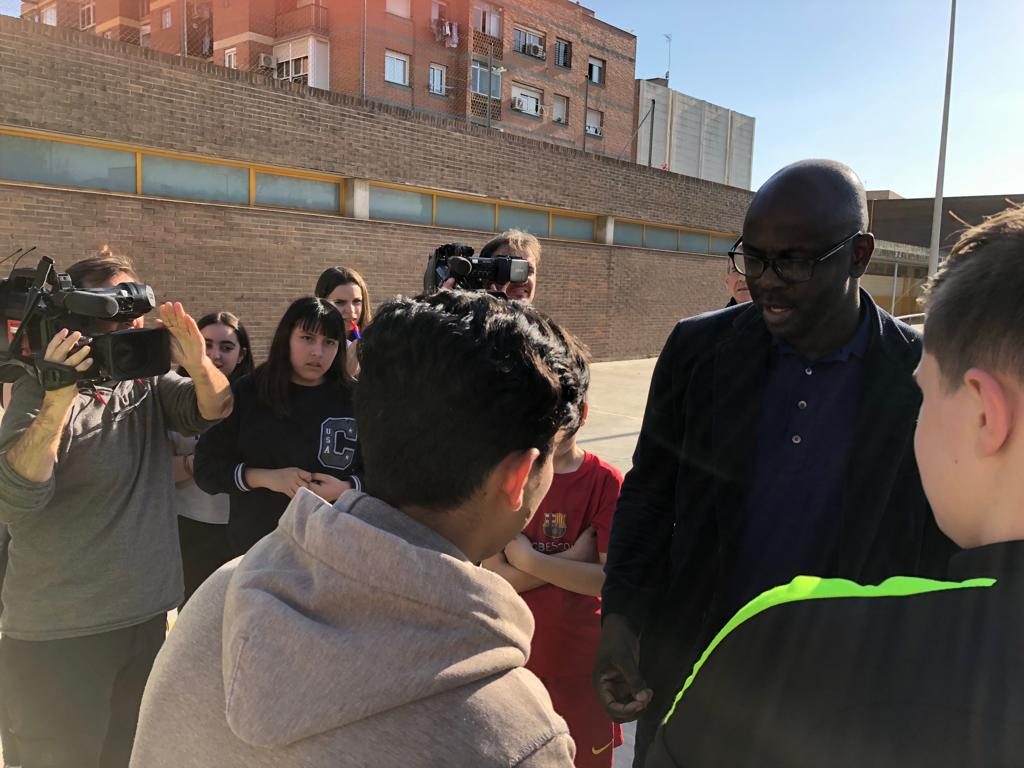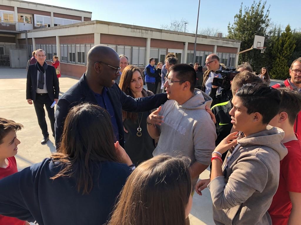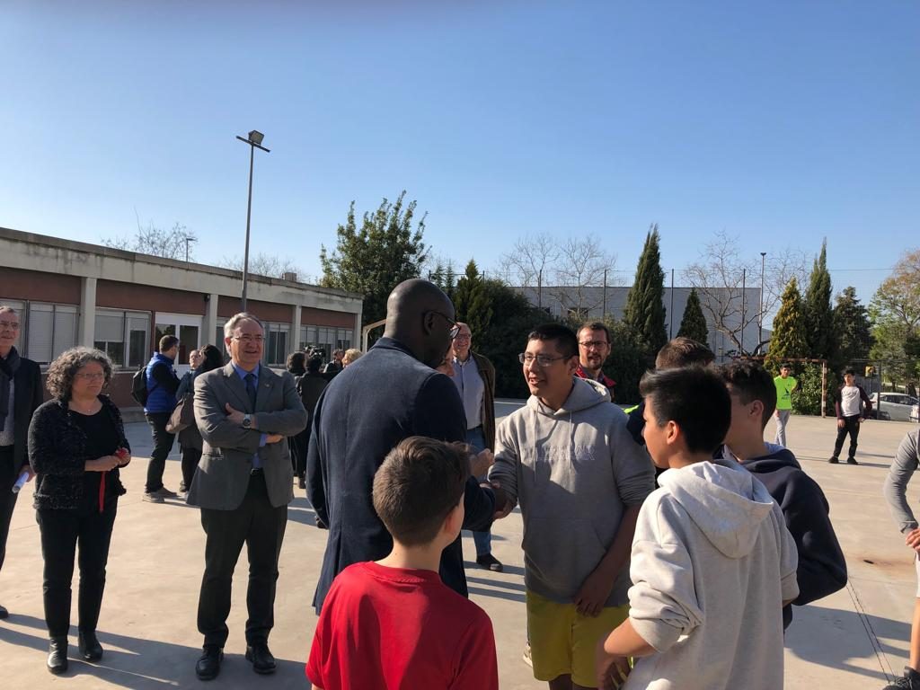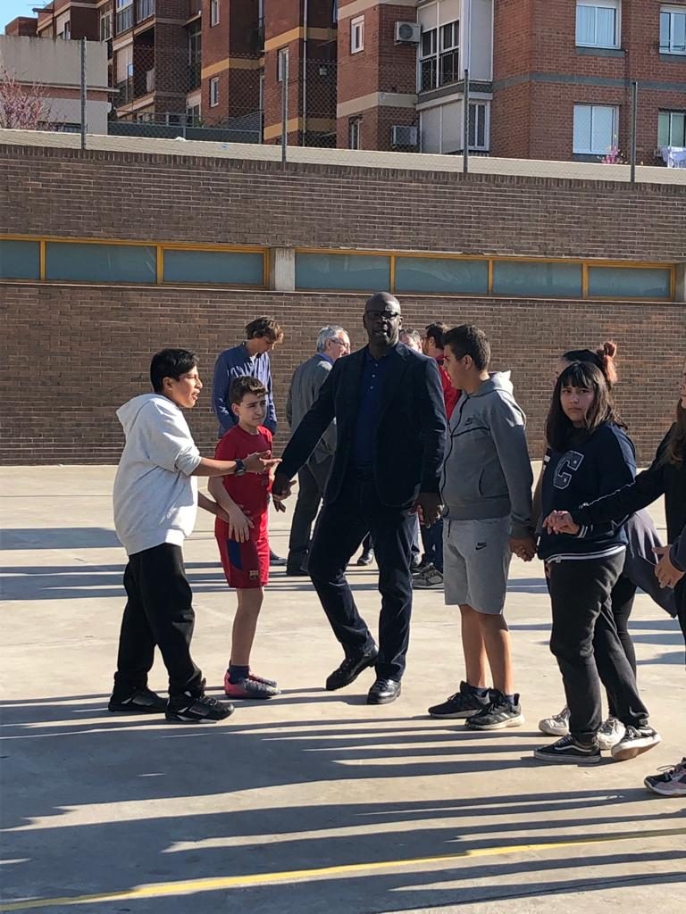 Lilian Thuram (exjugador del Barça) visita l’Institut Martí Dot i comparteix una estona de joc amb els alumnes.