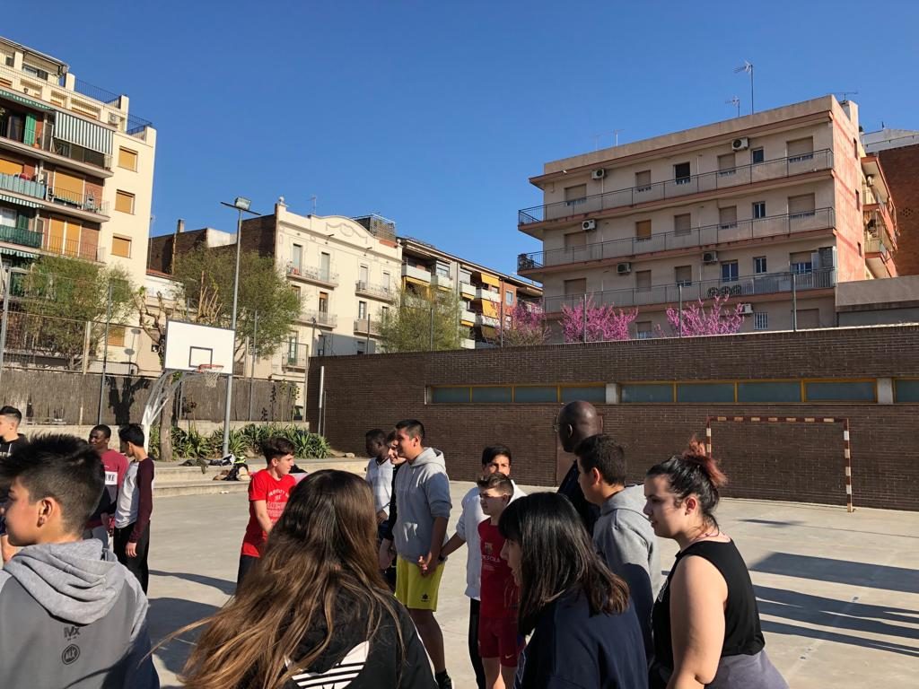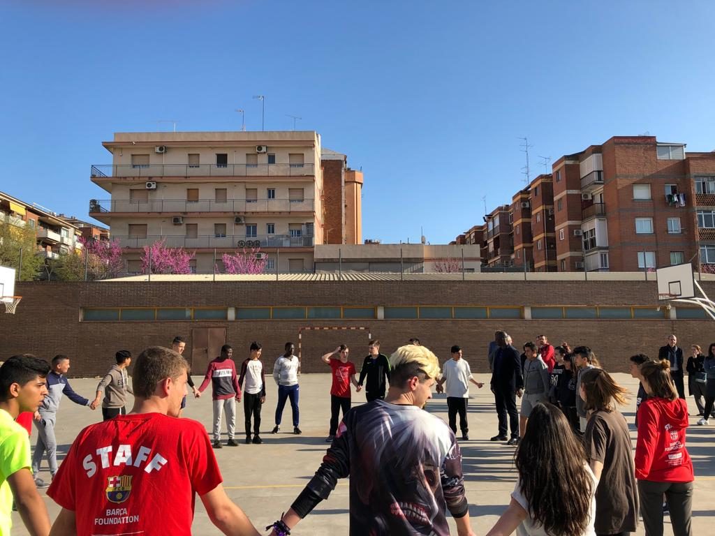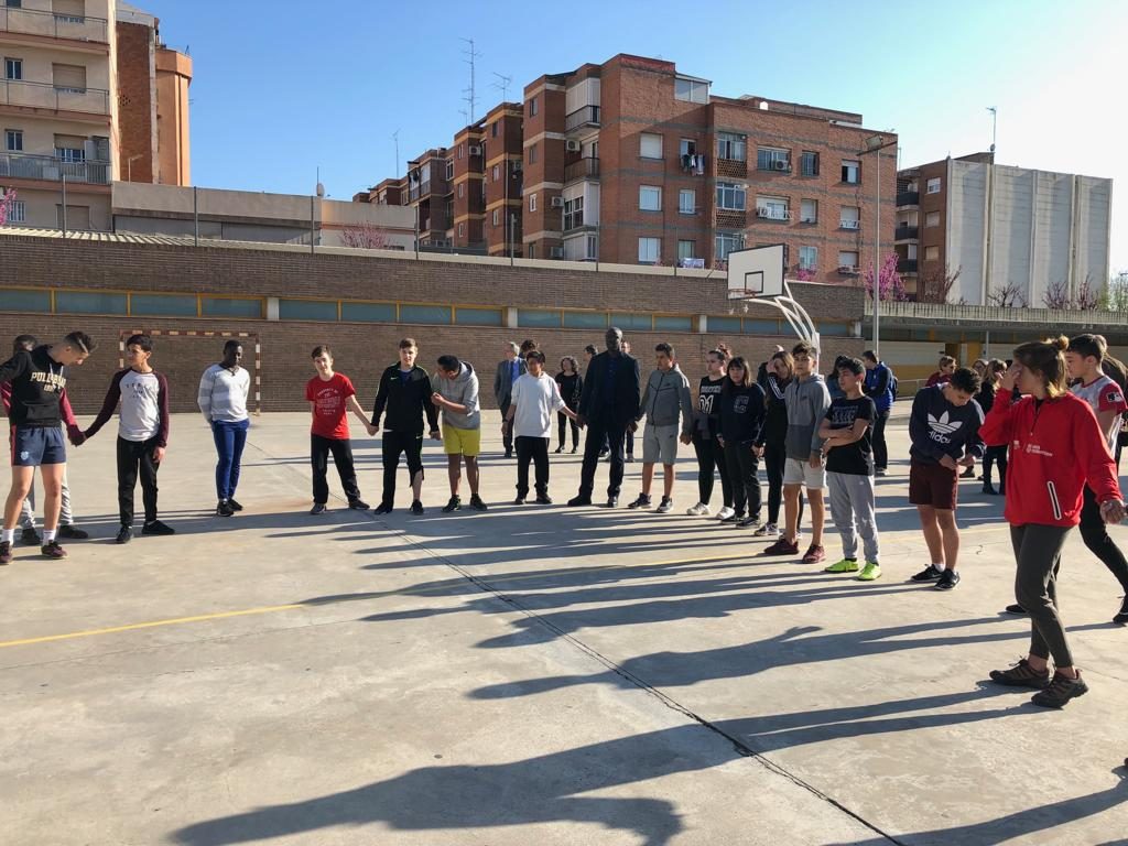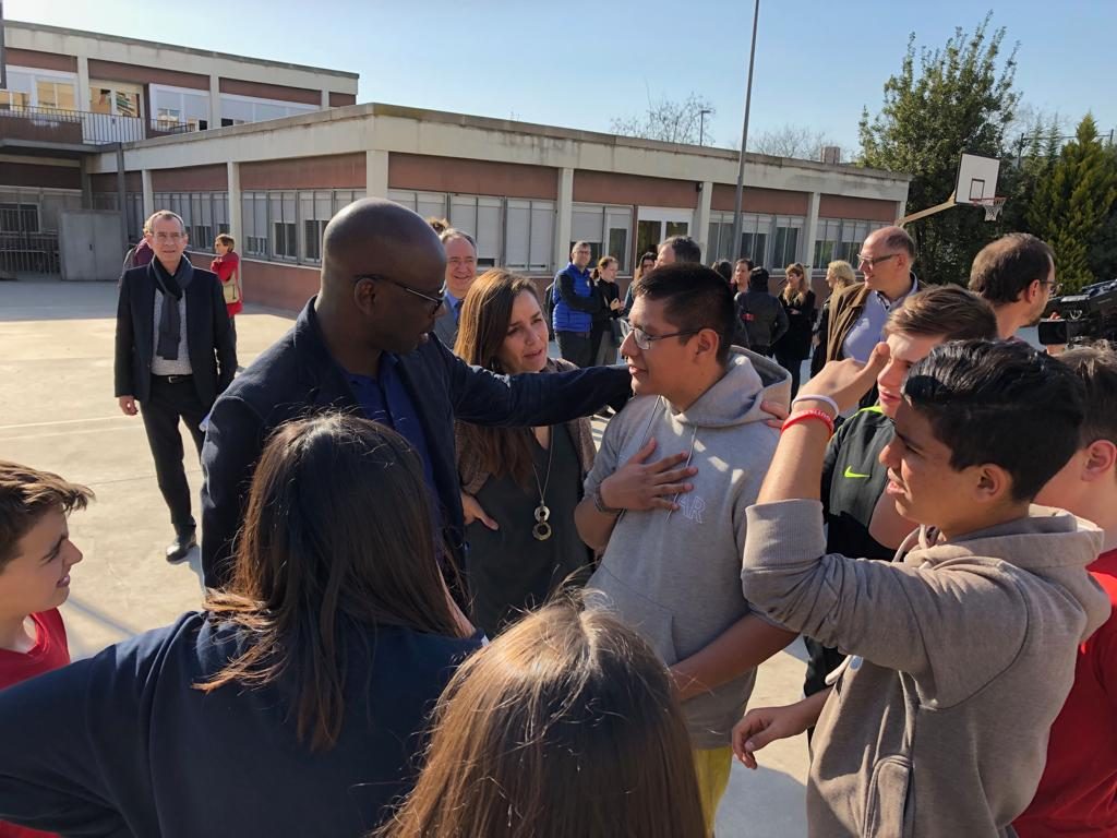 Lilian Thuram (exjugador del Barça) visita l’Institut Martí Dot i comparteix una estona de joc amb els alumnes.