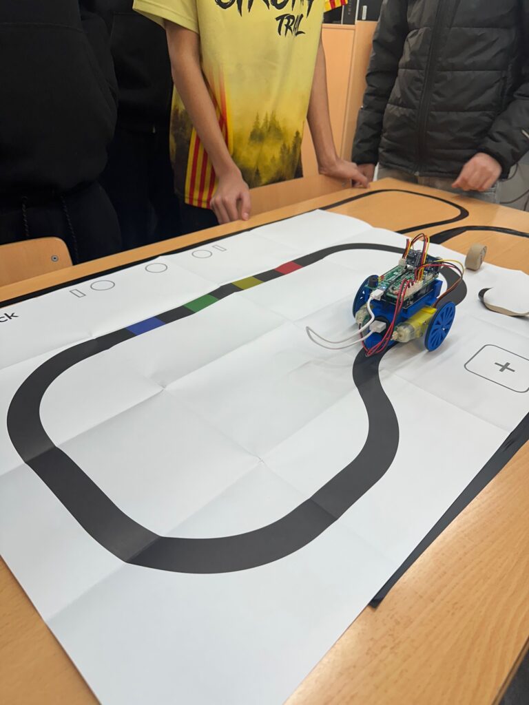 La part pràctica ha començat amb la programació per blocs mitjançant petits reptes amb Scratch, que han servit per comprendre la lògica computacional. Posteriorment, l’alumnat ha analitzat i experimentat amb cadascun dels components d’un robot seguidor de línies, realitzant proves i pràctiques per entendre’n el funcionament.