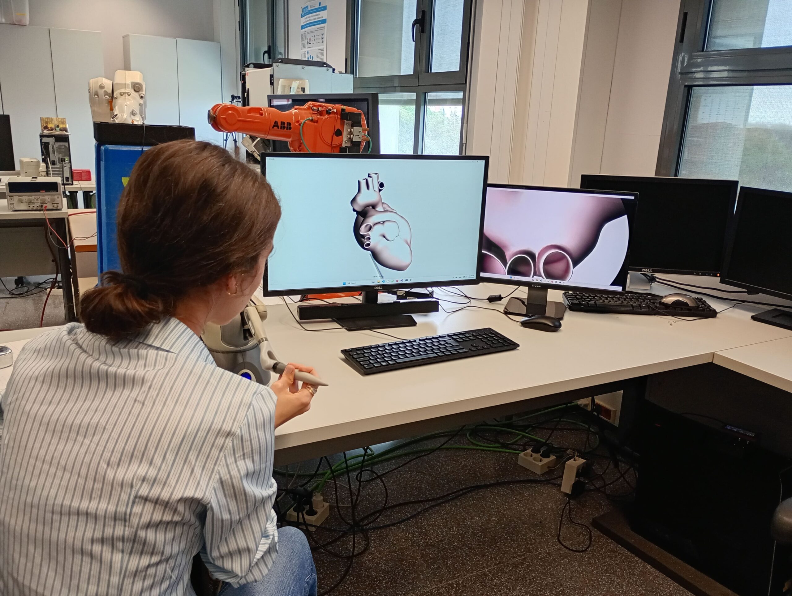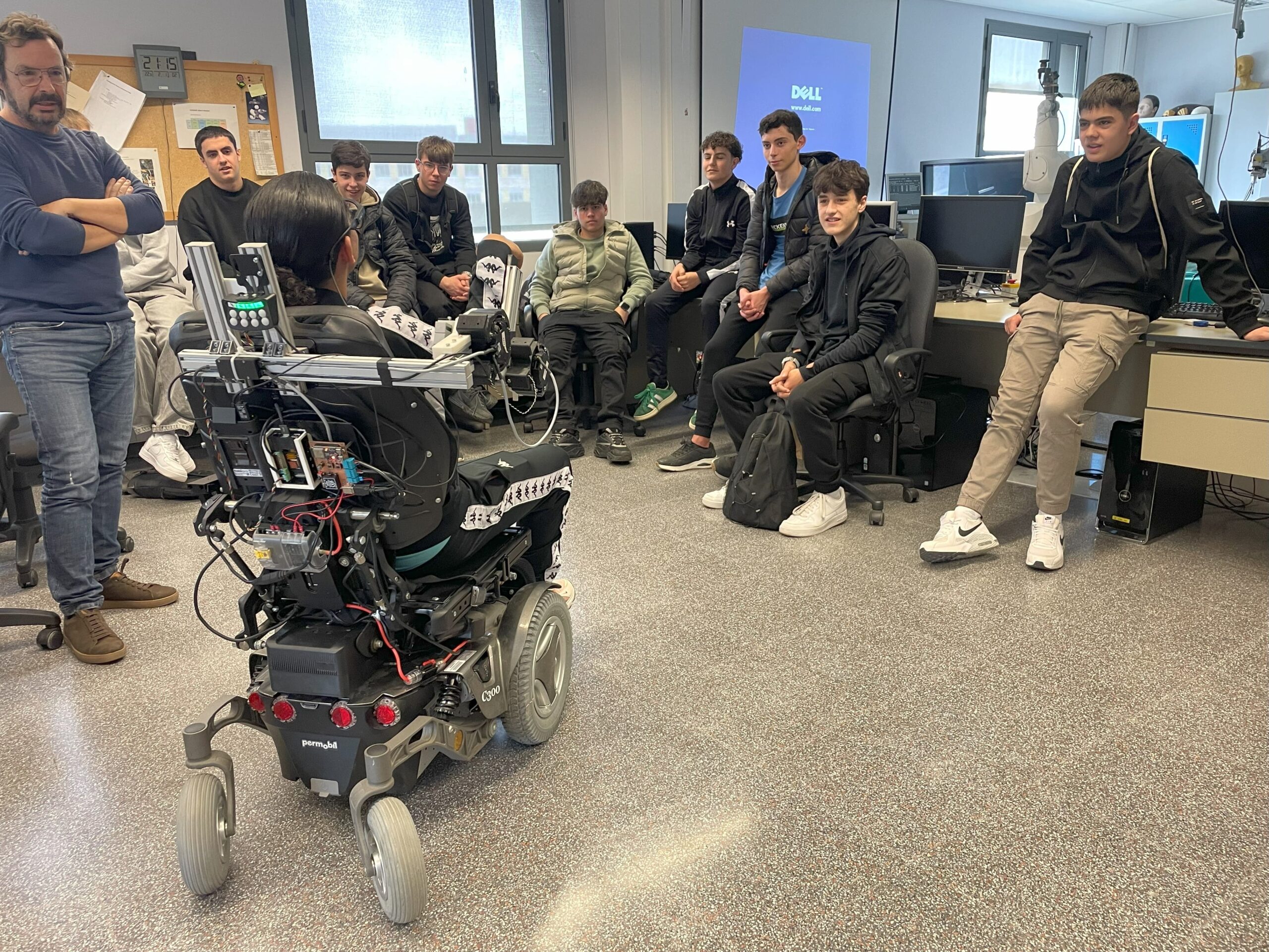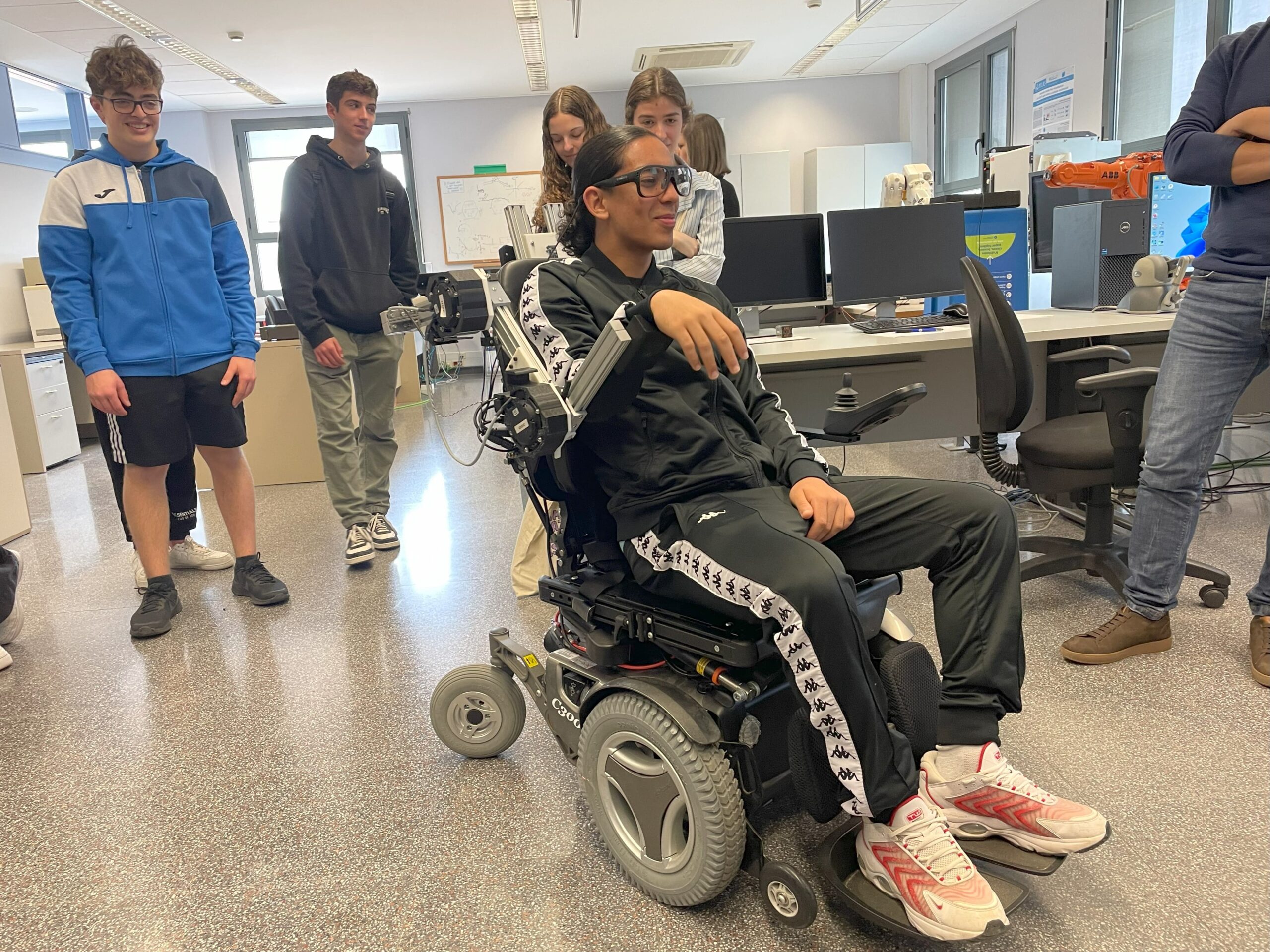 Posteriorment, la visita va continuar als laboratoris de robòtica assistencial de la UPC, on els alumnes van poder conèixer i provar diversos projectes d’innovació en l’àmbit de la salut. Entre els dispositius presentats, van destacar els sistemes robòtics per a assistència en cirurgia de precisió i una cadira de rodes intel·ligent, dissenyada per a persones amb paràlisi total, que es controla mitjançant unes ulleres amb seguiment ocular. Aquests avenços tecnològics mostren com la robòtica pot millorar la qualitat de vida i l’eficiència en el sector mèdic.