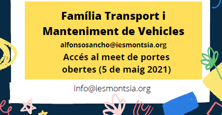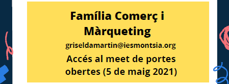 La jornada de portes obertes serà en format videoconferència (GoogleMEET) per informar i orientar acadèmicament a tothom que pugui estar interessat en la formació que impartim i resoldre els teus dubtes i preguntes. Podeu accedir al link  de la trobada online cliclant als cartells de sota d’aquest text. A més hi haurà la possibilitat de demanar cita prèvia per venir presencialment al centre del 5 de maig al 12 de maig via els/les caps de departament. Les cites han de ser de màxim 2 persones seguint les mesures establertes en temps de pandèmia. A sota teniu els mails corporatius dels/les caps de departament per tal que es pugui reservar data i hora ( a partir del dia 5 de maig). Sessions informatives de cada família professional a partir de les 19:30 h fins les 20:30 h.