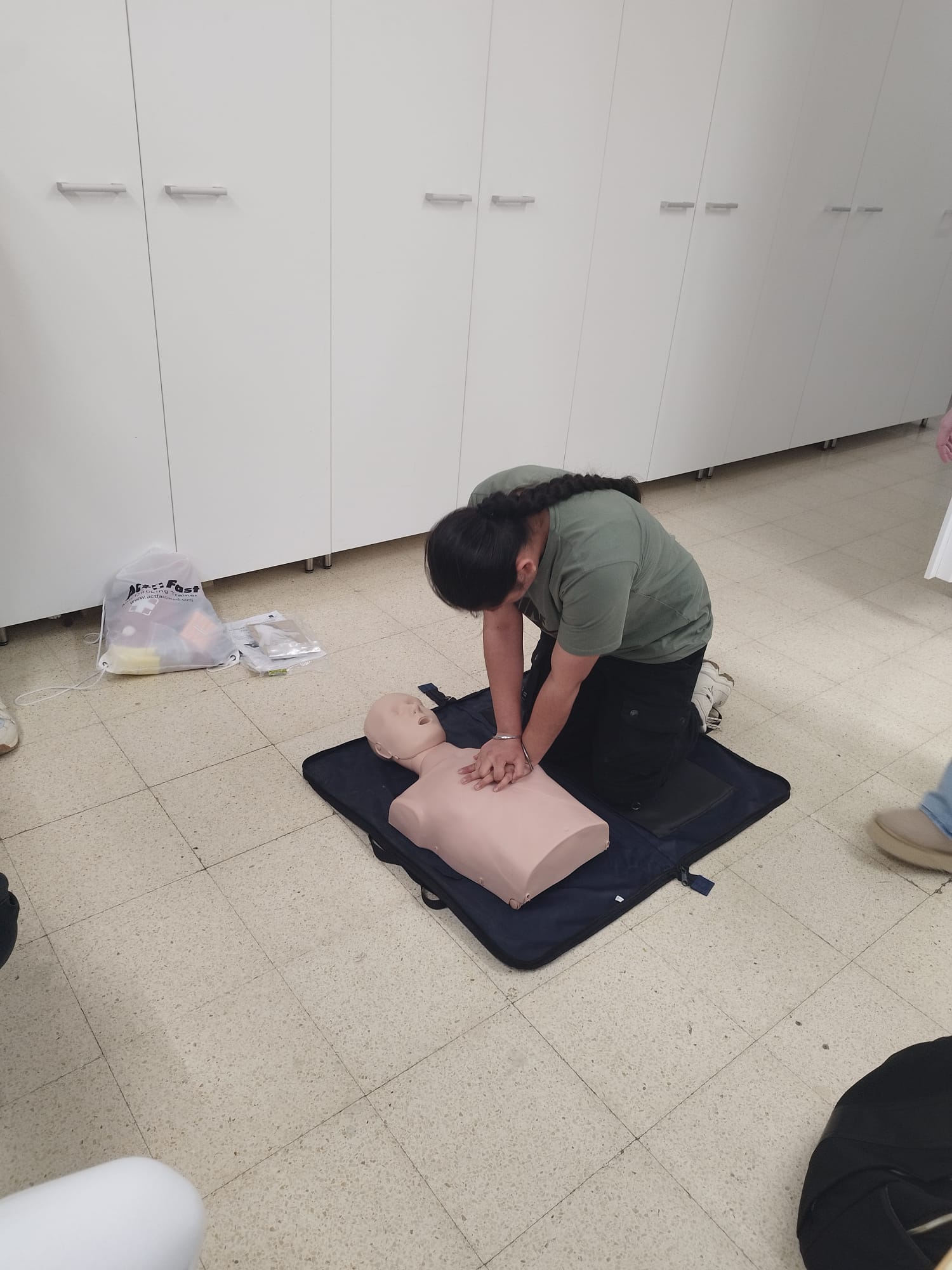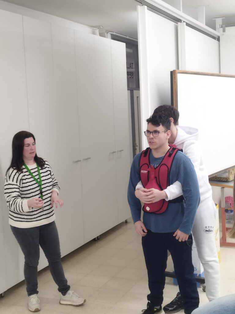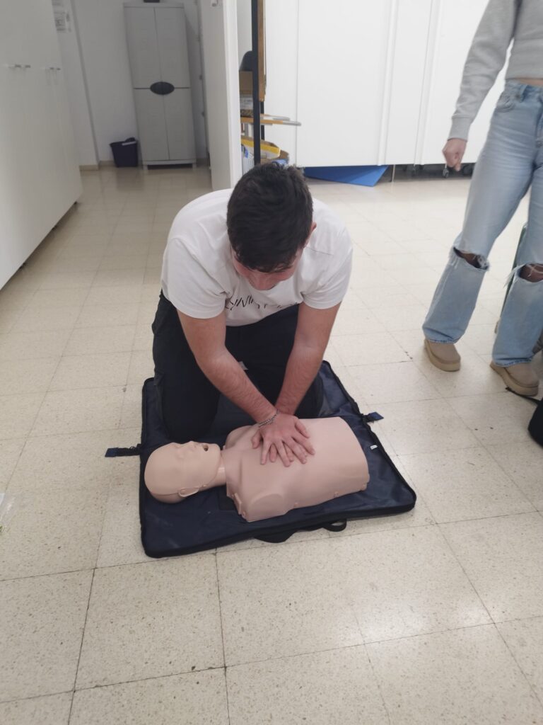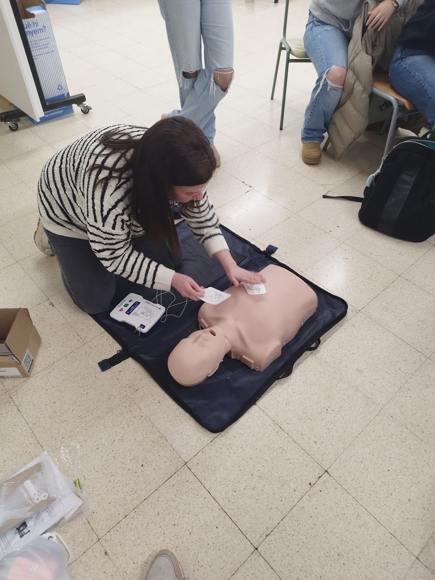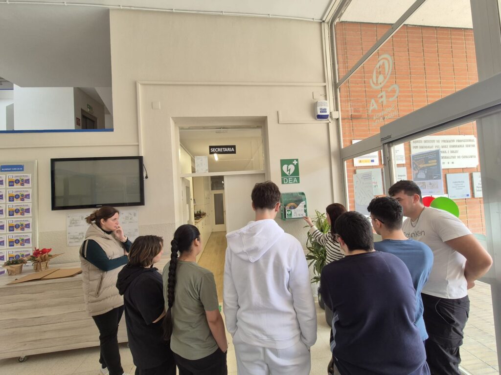 Durant el taller, l’alumnat va poder realitzar pràctiques molt realistes gràcies al material específic que el grup d’APESID va portar per a la sessió. A més, els participants també van conèixer la ubicació del DEA del centre i el seu funcionament, que es va explicar mitjançant un simulador.