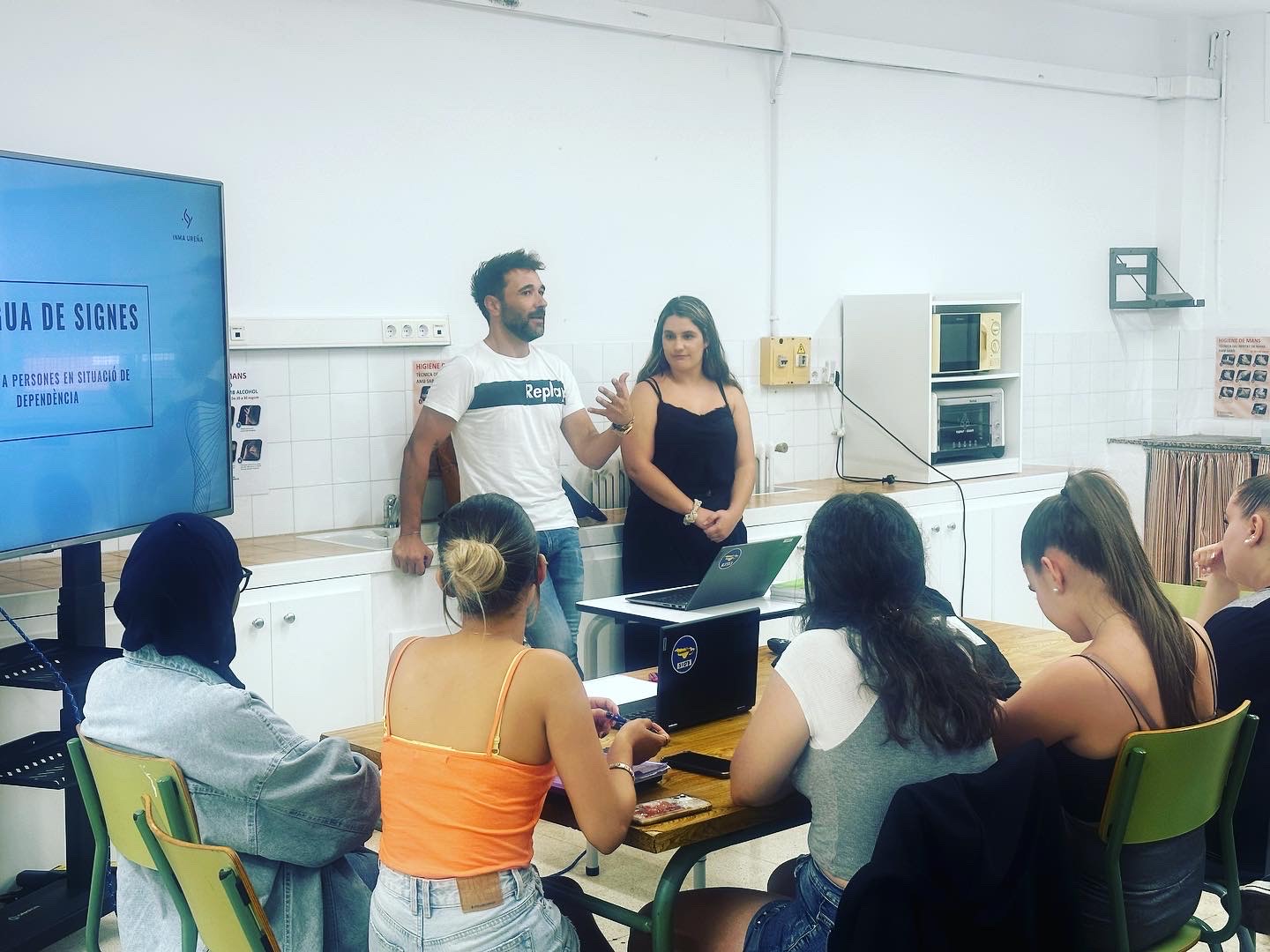 Una xerrada que s’emmarca dins del MP8 Suport a la Comunicació del CFGM Atenció a Persones en Depedència. Poder gaudir d’una persona que faci ús dels diferents sistemes alternatius a la comunicació ha donat un aire de realisme a l’aula i les expectatives de l’alumnat en relació a l’aprenentatge. Agrair al Departament de Turisme per la seva implicació i col.laboració des del primer moment, ja que l’alumna Inma Ureño Domingo del CFGS de Gestió d’Allotjaments Turístics fa ús diari del llenguatge de signes i és per aquest motiu que la seva exposició i xerrada en relació al propi llenguatge de signes ha fet enriquidora tant la teoria com la part funcional de la pràctica, fent més proper l’aprenentatge a l’alumnat del CFGM d’EDIN. De tot plegat n’ha sortit un projecte interdepartamental del que ja en sentirem a parlar. Professorat promotor: David Gámez i professorat assistent: Andreu Fabregat i Thais Bonet.
