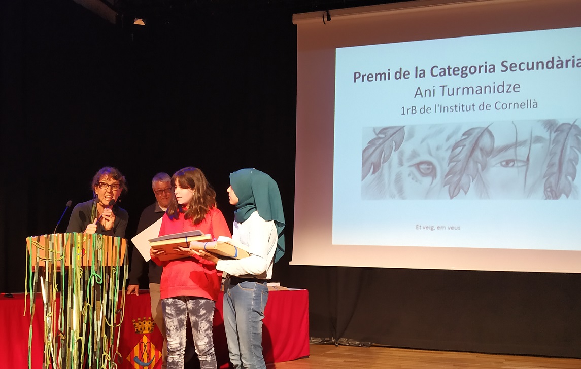 L’alumna de 1r d’ESO B Ani Turmanidze va ser la guanyadora de la Categoria “1r cicle d’ESO”, un dibuix titulat “Et veig, em veus”. L’Andrea i la Souad van pujar a l’escenari a recollir el premi, atès que l’Ani va tornar al seu país, Georgia, el passat mes de gener, poc desprès d’haver lliurat el treball que després ha resultat guanyador.