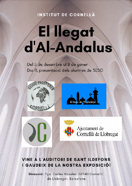 L’origen de l’exposició, vinculada al currículum de ciències socials, llengua catalana i llengua castellana, sorgeix a partir de l’encàrrec que ens va fer l’associació “Cornellà Sense Fronteres”, que van venir a l’Institut per demanar al nostre alumnat de 3r d’ESO que elaborés una exposició sobre el Llegat de l’Al-Àndalus. A partir d’aquí s’ha estat treballant la petjada que va deixar la cultura andalusí i islàmica a la Península i, en general, en el món mediterrani medieval. Un llegat que impregna els nostres paisatges urbans, l’economia, la ciència, l’enginyeria o l’arquitectura. I aquesta herència es nota especialment en les nostres pròpies llengües i costums.