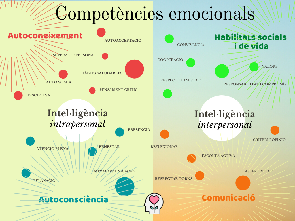 competències: l’autoconsciència, l’autoconeixement, les habilitats socials i de vida i la comunicació. Volem que aquest aprenentatge socioemocional ajudi la comunitat educativa a desenvolupar i practicar habilitats d’intel·ligència emocional, en un procés interactiu d’ensenyar, aprendre i practicar.