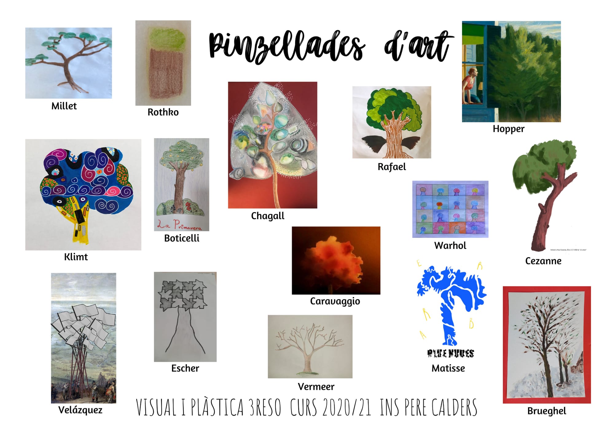 “Pinzellades d’Art” és l’últim projecte que ha estat treballant a visual i plàstica l’alumnat de tercer d’ESO. A partir de l’anàlisi d’un quadre han investigat sobre el pintor, els artistes contemporanis, l’època, les característiques del moviment artístic,… Finalment els hem demanat que posessin en joc la seva imaginació pensant com hagués interpretat el pintor un objecte (arbre, ocell, poma, brota,…). Mireu els resultats, estan fets uns artistes!