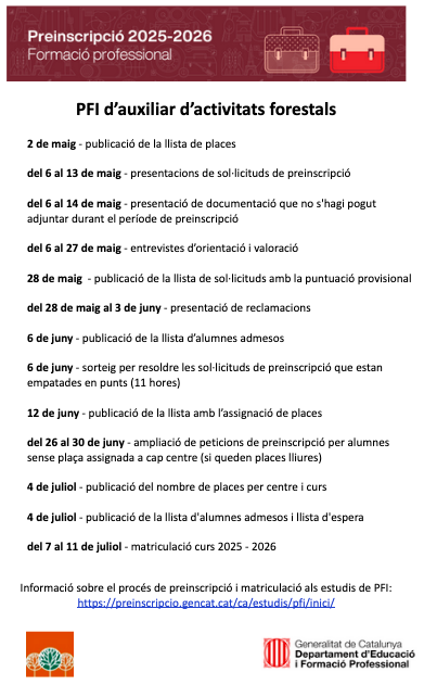 Preinscripció i matrícula curs 25-26 PFI d’auxiliar d’activitats forestals