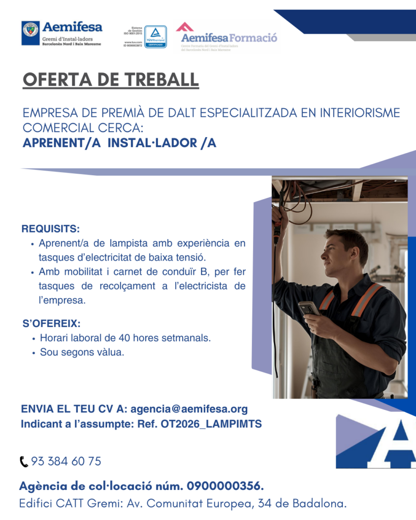- Oferta de treball per a titulats/des en el CFGM d’Instal·lacions Elèctriques i Automàtiques. (Gremi d’Instal·ladors)