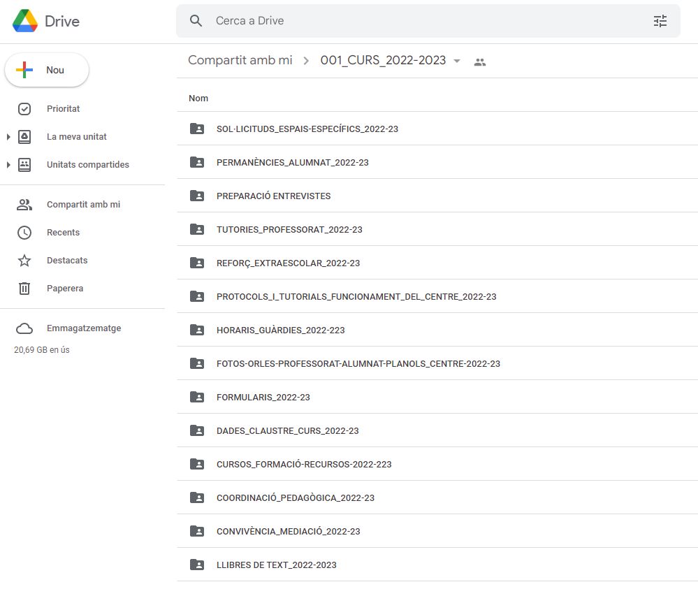 El centre organitza part de la documentació en unitats compartides. Aquestes unitats es comparteixen exclusivament amb grups, de tal manera que en tot moment es controla qui té accés a la informació.