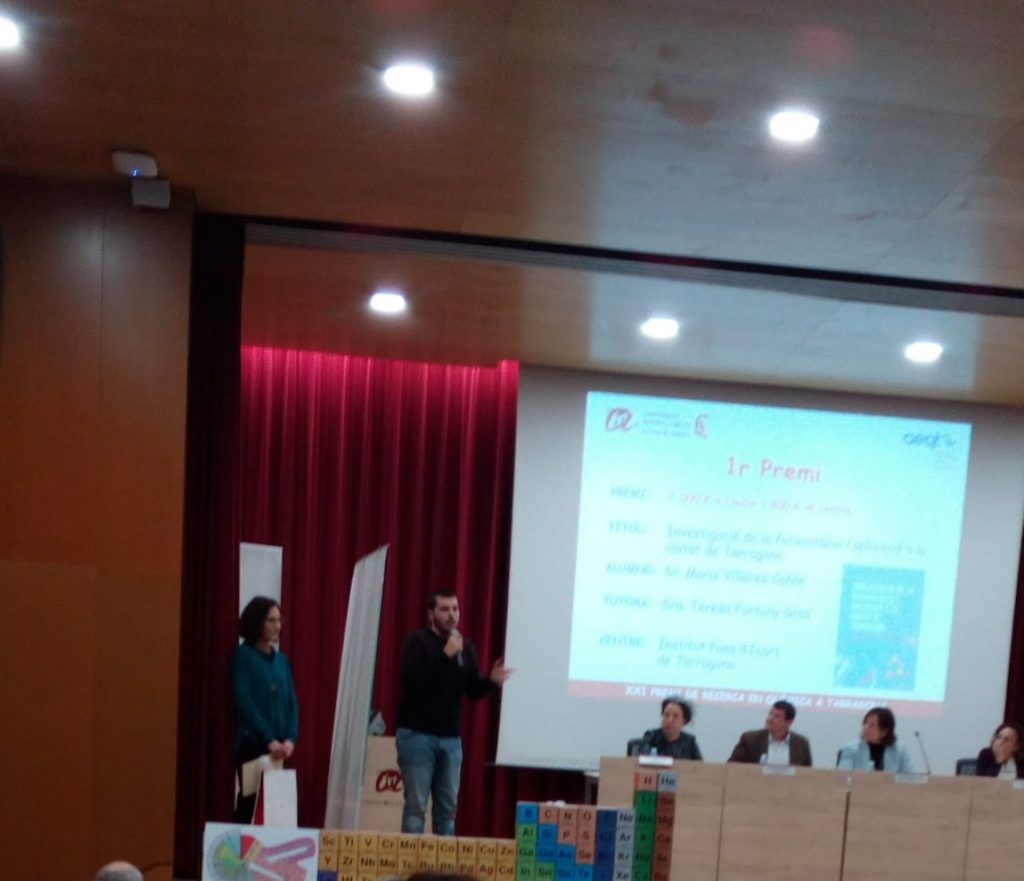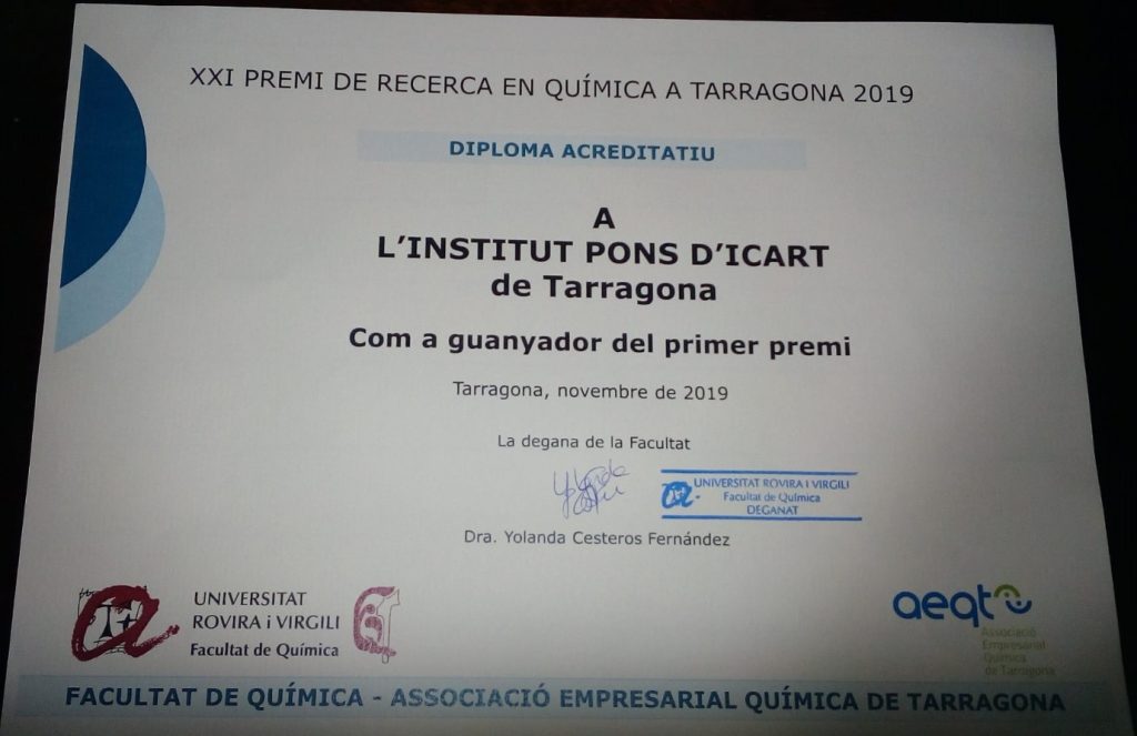 Ens complau comunicar que Mario Villares Cañón, alumne de l’institut en la promoció 2017-2019, ha sigut el guanyador del XXI Premi de Recerca en Química que organitza la Facultat de Química de la URV des de l’any 1991 i que està patrocinat per l’Associació Empresarial Química de Tarragona (AEQT) amb el treball de recerca (TDR) anomenat “Investigació de la fotocatàlisi i aplicació a la ciutat de Tarragona” i dirigit per la professora Teresa Fortuny.