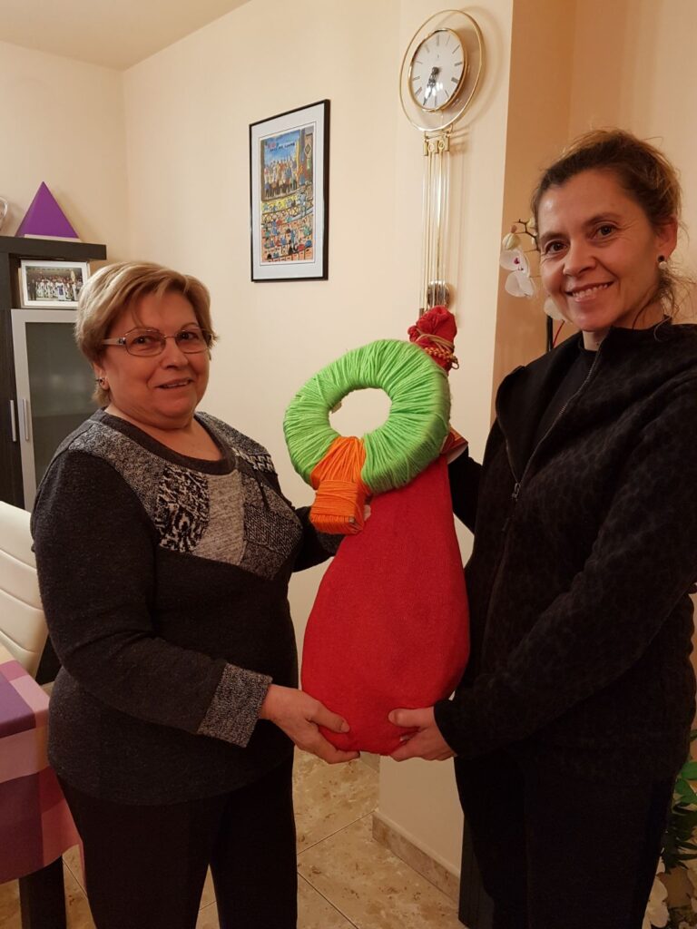 Maria Traveset a estat la guanyadora del pernil que es sortejava amb els números venguts pels alumnes de 4rt de ESO. A la foto, la Montse Casafont, representant de l’AMPA li fa l’entrega.