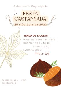 Castanyada 2022Per admin / 16/10/2022 / Noticies Aquí hi veureu tots els cartells que hem preparat l’alumnat de 4t d’ESO per la Castanyada del 28 d’Octubre. I aquí unes quantes fotos.