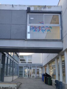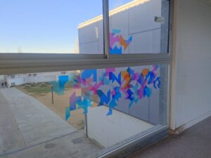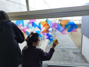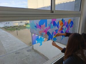 Després de la presentació, els alumnes van passar a l’acció amb la creació d’una intervenció col·lectiva en vinil sobre vidre. Aquesta obra, que juga amb la llum i la transparència, es pot gaudir tant des de l’interior de l’institut com des del pati, deixant una empremta creativa que transforma l’espai.