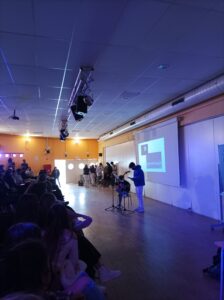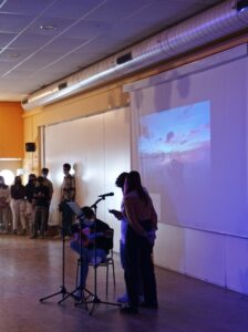 Els poemes van ser acompanyats amb música i imatges, amb projeccions de fons. Un dels alumnes de segon, Iker Montes, va fer un acompanyament d’arpegi amb la guitarra.