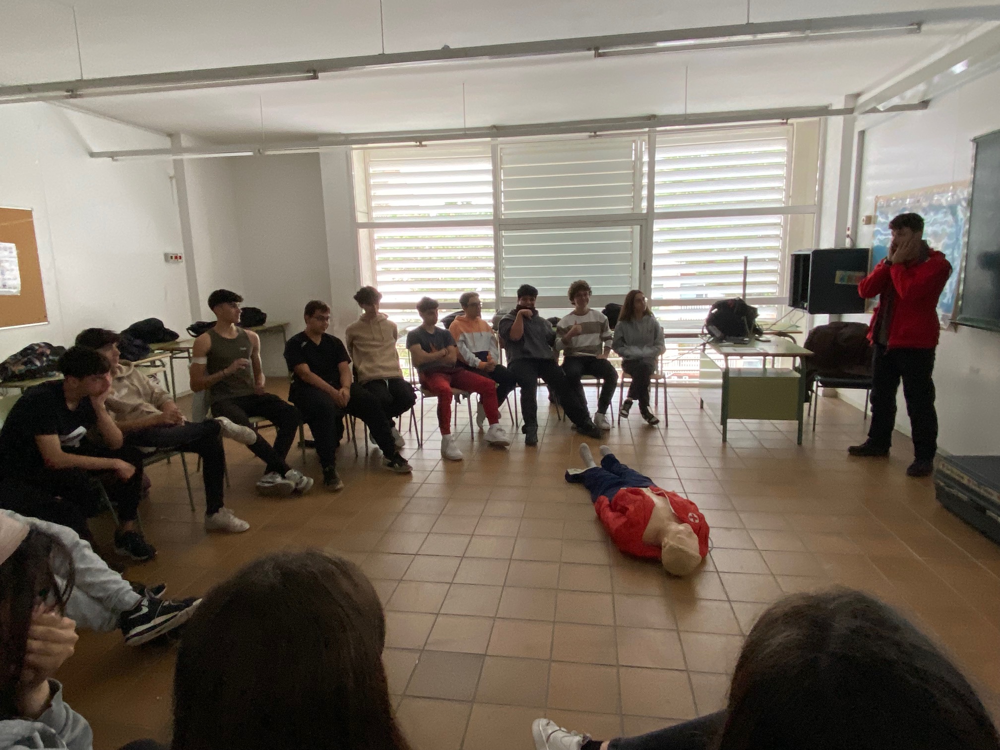 Aquesta darrera setmana, els alumnes de 4t d’ESO han fet un taller de primers auxilis bàsic. L’activitat era de quatre hores; les dues primeres eren més aviat teòriques, on explicaven amb ajuda d’un power point les maniobres i els casos que es podien trobar. També amb un vídeo explicaven com afrontar les situacions de persones en perill. Les altres dues hores eren pràctiques, i van fer coses com, per exemple, dos minuts de reanimació amb un maniquí, entre d’altres.