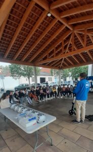 El taller ha combinat el coneixement de la mobilitat en patinet elèctric a la via pública en un circuit tancat a la plaça de la Porxada, amb les activitats prèvies de preparació per a la conducció.