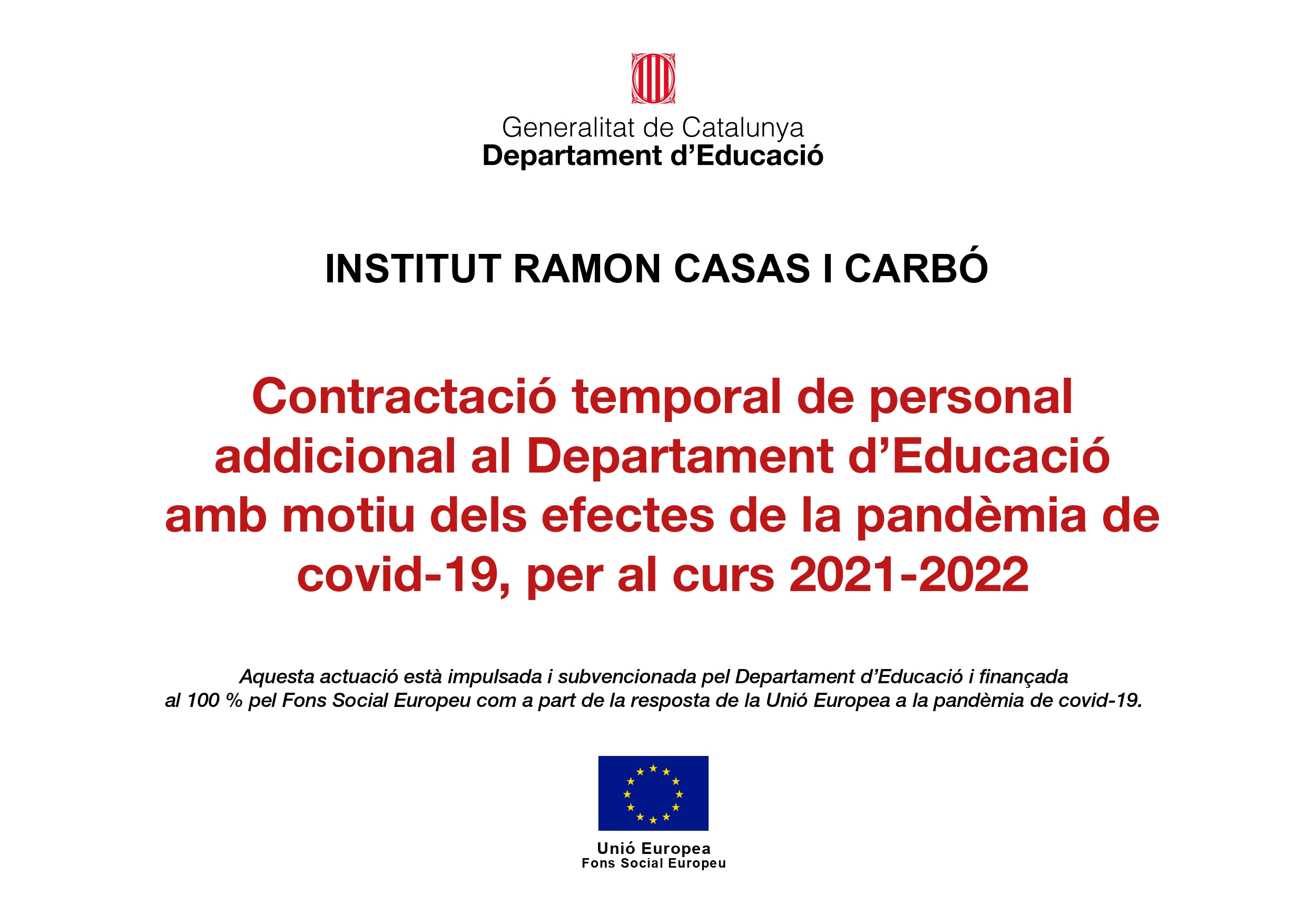 El nostre institut ha rebut una dotació extra de professorat del Fons d’Acció Social Europeu amb motiu dels reforços per la Covid-19. En concret tenim 3 professores més a la plantilla.