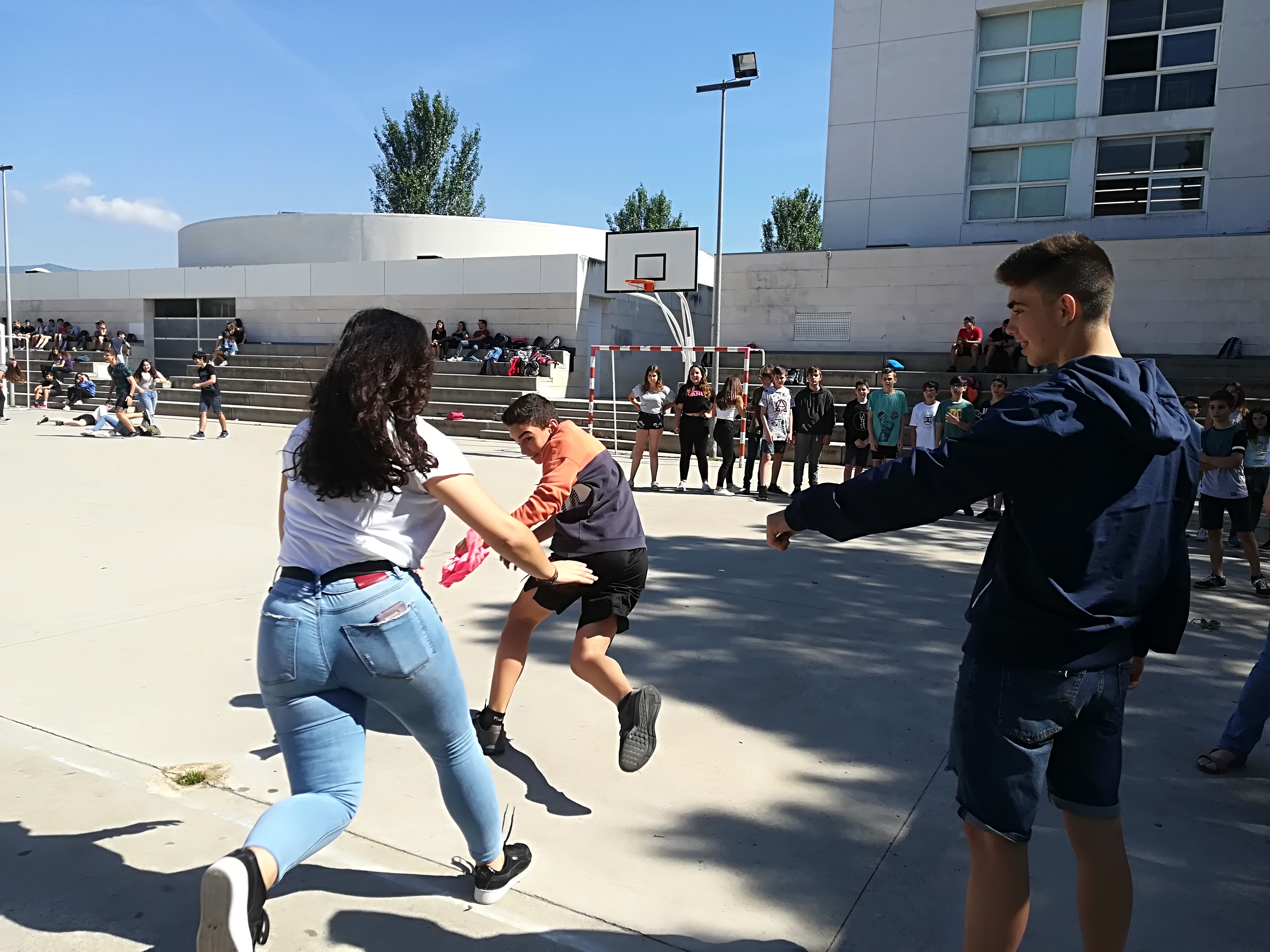 Aquesta tercera trobada la vam celebrar el divendres dia 8 de juny a l’hora de Tutoria, de manera que tots els primers i quarts van anar al pati. Els alumnes estan aparellats per agrupacions així els de 4tA són padrins dels de 1r A, 4B són padrins de 1rB , 4tC del 1rC, 4tD del 1rD i 4t E del 1r E. Cada padrí havia de buscar el seu fillol (les parelles padrins-fillols ja estaven fetes des de principi de curs) i després d’uns minuts d’intercanvi d’experiències sobre l’adaptació a l’Institut vam començar una sèrie de jocs en les que havíen de competir padrí i fillol.