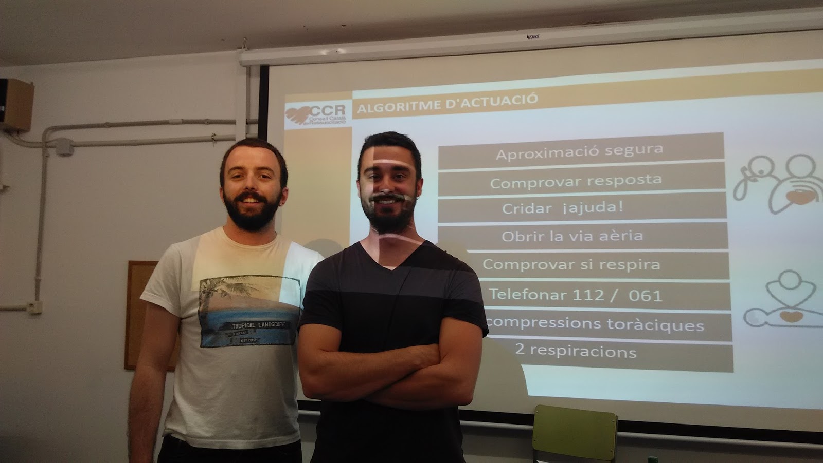En els dos dies que ha durat el taller, el canvi de coneixements ha estat abismal! Si en la primera sessió no teniem massa clar quin era el procediment a seguir en cas d’urgència i actuació en una situació de primers auxilis, en la segona vam donar uns resultats excel·lents! La taca d’oli s’està expandint. Els dos estudiants d’infermeria han apostat per traspassar els seus coneixements als alumnes de 3r d’ESO del nostre institut i ara més persones tenen recursos bàsics per actuar en una situació d’emergència en la que es requereixi una reanimació càrdio-pulmonar.
