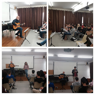 Como viene siendo una tradición ya en nuestro centro, el cantautor Emiliano Valdeolivas actuó el pasado lunes 19 de noviembre en la sala de actos para el alumnado de 1º de Bachillerato. Con su recorrido poético y musical por la poesía española, desde las obras más lejanas en el tiempo, como el Cantar de Mio Cid, hasta los autores más próximos en el tiempo, como Gloria Fuertes, el cantante logró ganarse gradualmente a su auditorio hasta que todos terminaron cantando y siguiendo el ritmo con palmas.