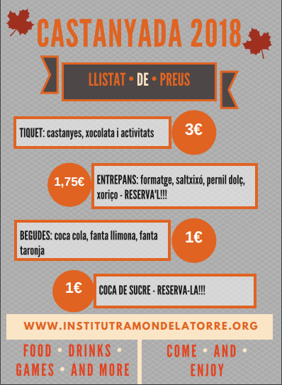 els alumnes de 4t vendran Tiquets (castanyes + xocolata + activitats per 1r, 2n i 3r d’ESO), al preu de 3€ (veure arxiu adjunt).