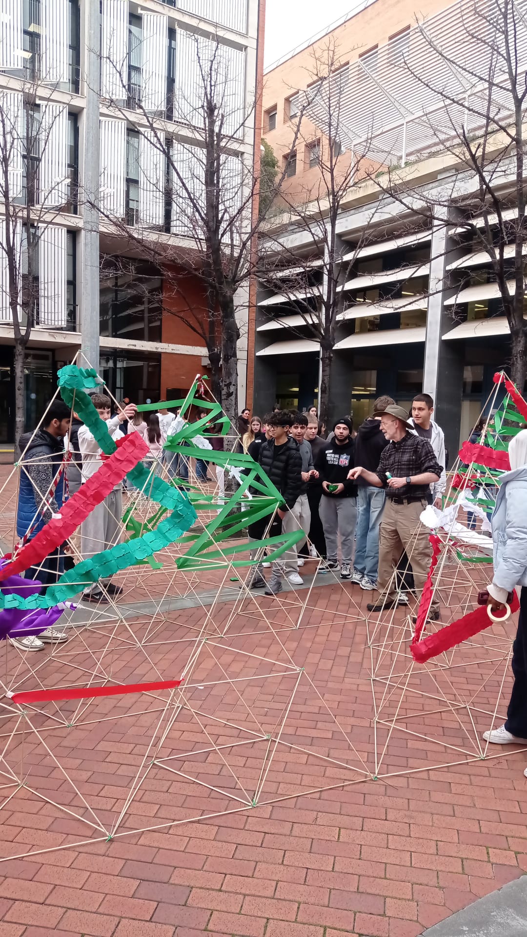 La jornada ha començat amb una dinàmica de cohesió de grup, en què l’alumnat ha treballat conjuntament per construir una piràmide gegant de cinc metres d’alçada. A continuació, els participants han dut a terme una sessió de brainstorming per generar idees i decidir quin projecte volien desenvolupar durant la hackató.