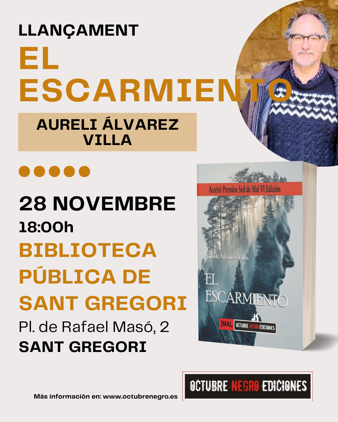 Aquesta setmana hem rebut una molt bona notícia de part d’un dels nostres docents, l’Aureli Álvarez Villa. El passat 1 d’octubre va anar a Madrid per recollir un premi de novel·la negra, un reconeixement que inclou la publicació de la seva obra. La novel·la, titulada El escarmiento, ja és una realitat i serà presentada el proper divendres 28 a la Biblioteca Municipal de Sant Gregori (Girona).