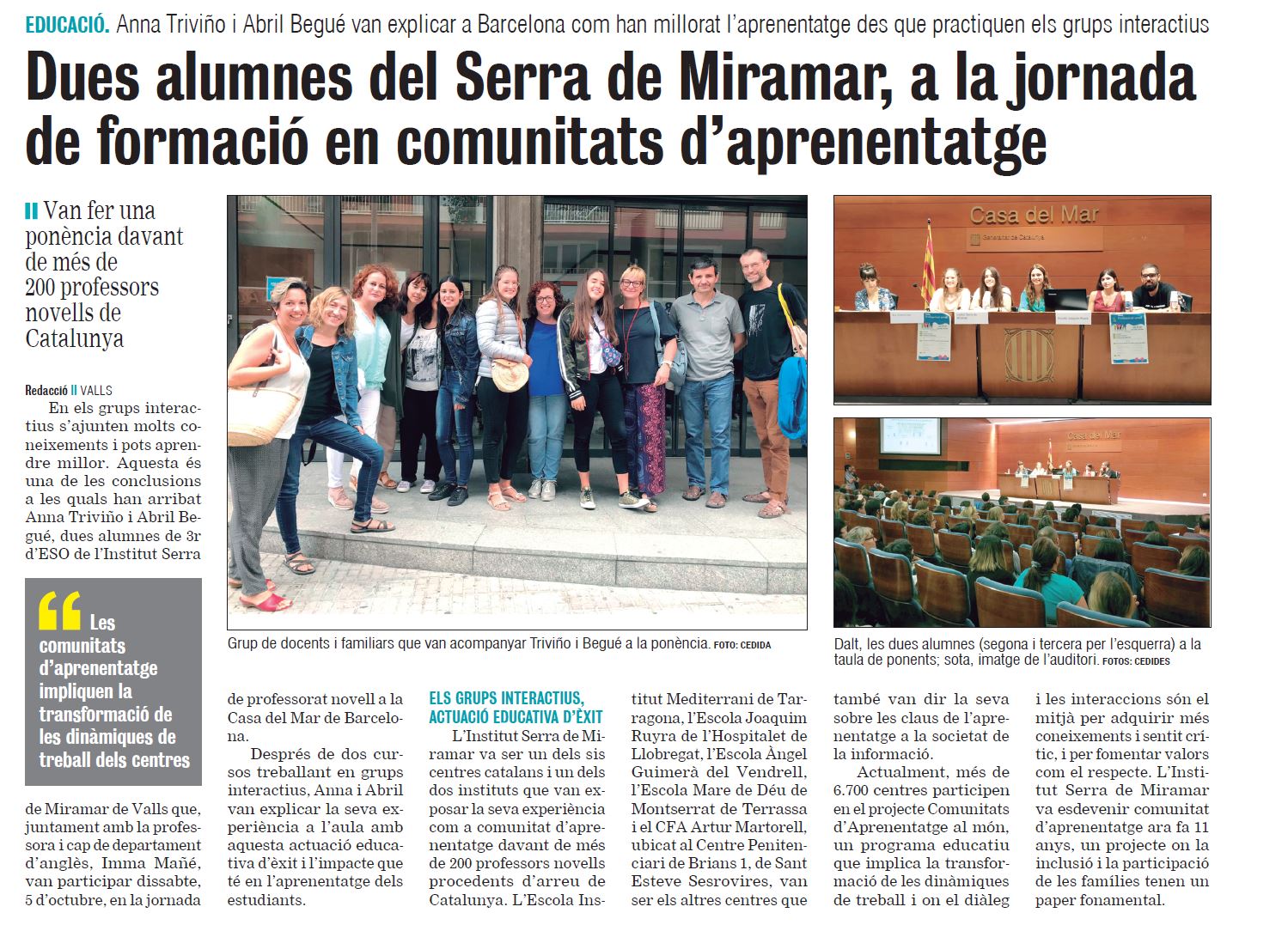 Dues alumnes del Serra de Miramar, a la jornada de formació en comunitats d’aprenentatge